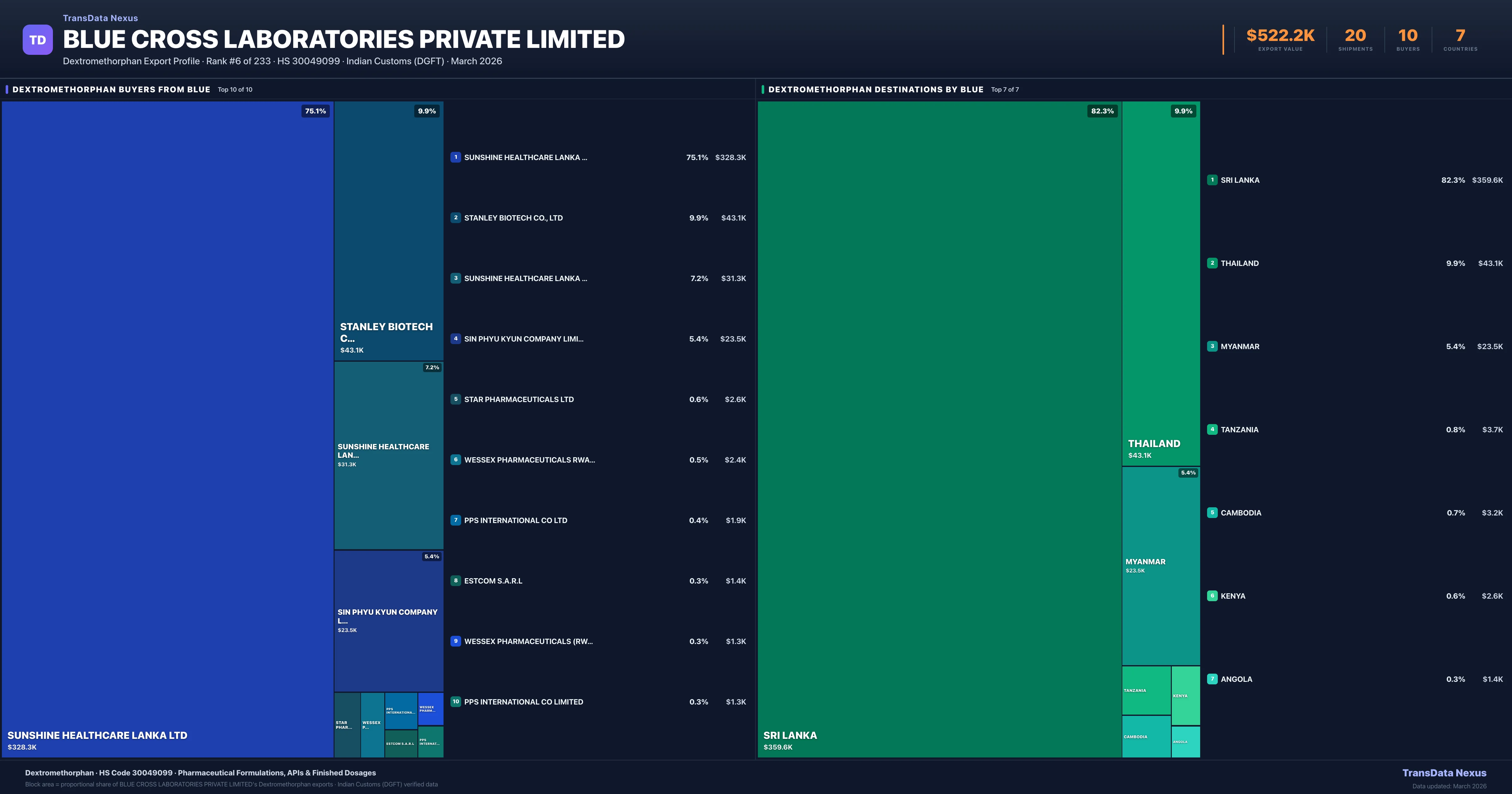 Blue Cross Laboratories Private Limited supplies Dextromethorphan to 10 buyers globally. The largest buyer is SUNSHINE HEALTHCARE LANKA LTD (SRI LANKA), followed by STANLEY BIOTECH CO., LTD (THAILAND) and SUNSHINE HEALTHCARE LANKA LIMITED (SRI LANKA). These buyers represent pharmaceutical distributors, hospital groups, and government procurement agencies in their respective markets.
