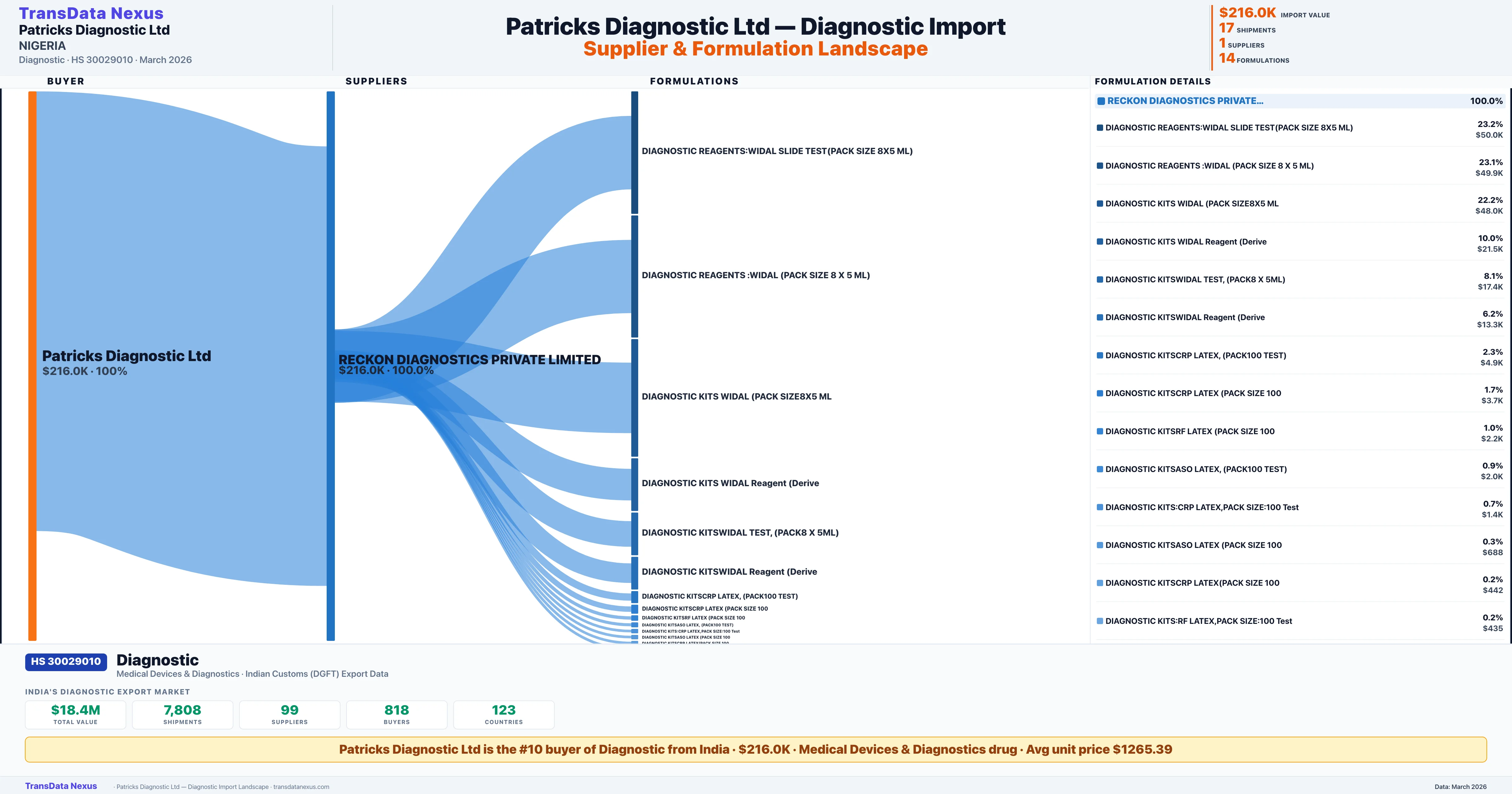PATRICKS DIAGNOSTIC LTD sources Diagnostic from 1 verified Indian supplier: RECKON DIAGNOSTICS PRIVATE LIMITED ($216.0K, 100.0%). This is based on 17 customs records.