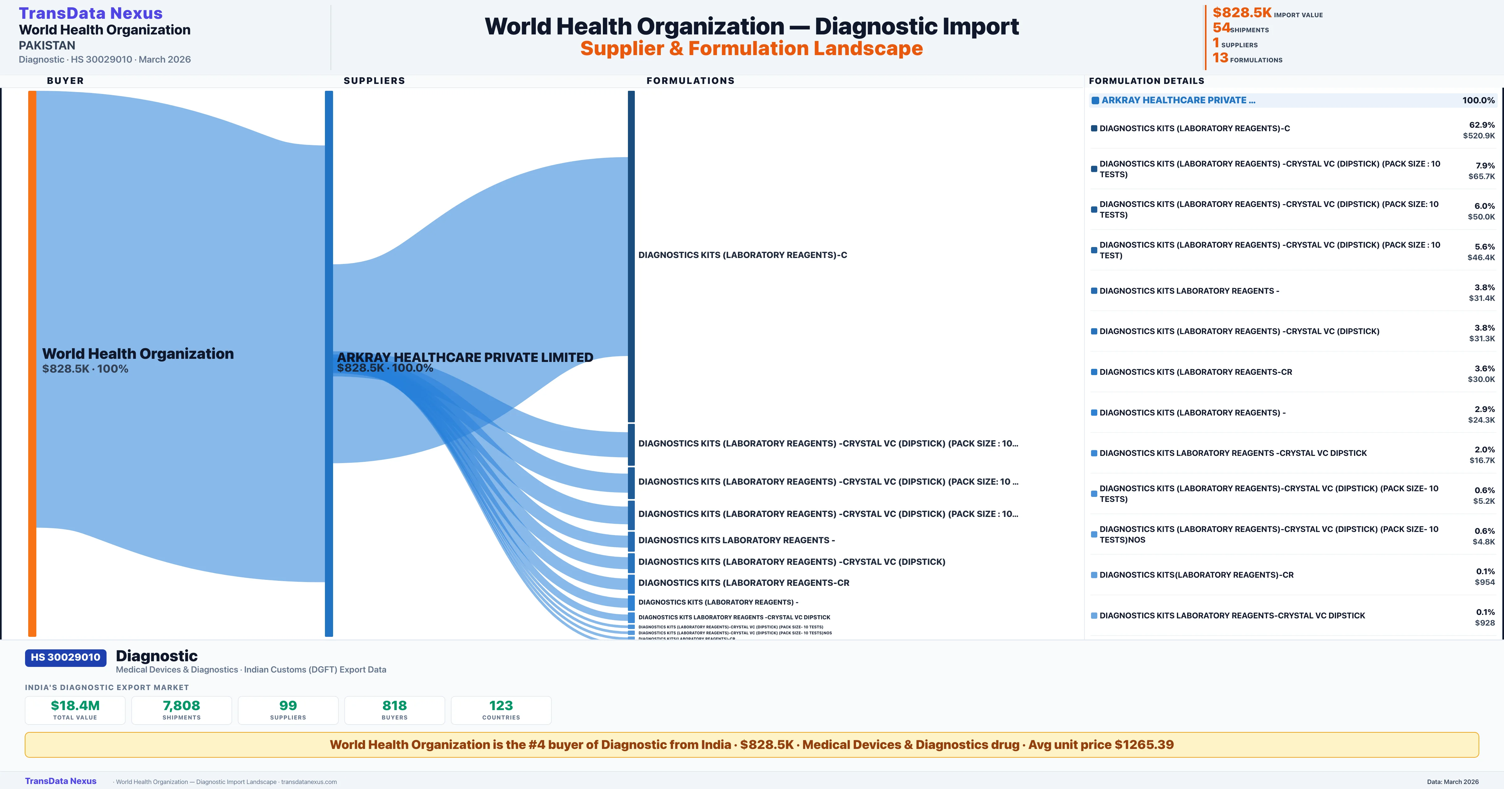 WORLD HEALTH ORGANIZATION sources Diagnostic from 1 verified Indian supplier: ARKRAY HEALTHCARE PRIVATE LIMITED ($828.5K, 100.0%). This is based on 54 customs records.