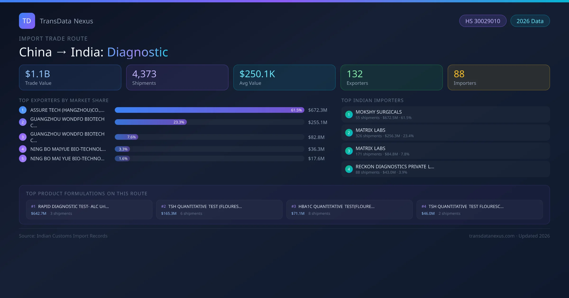The China to India Diagnostic corridor is one of India's established pharmaceutical import routes from China, with 4,373 shipments documented worth a combined $1.1B USD. The route is dominated by ASSURE TECH (HANGZHOU)CO.,LTD , which alone accounts for roughly 61% of all import value, reflecting the consolidated nature of China's diagnostic export sector.