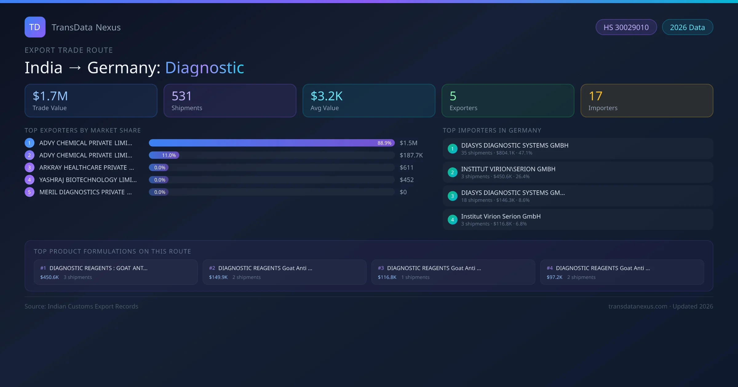 - 1.Route Identification: India to Germany export trade corridor identified from Indian Customs (DGFT) records for Diagnostic.