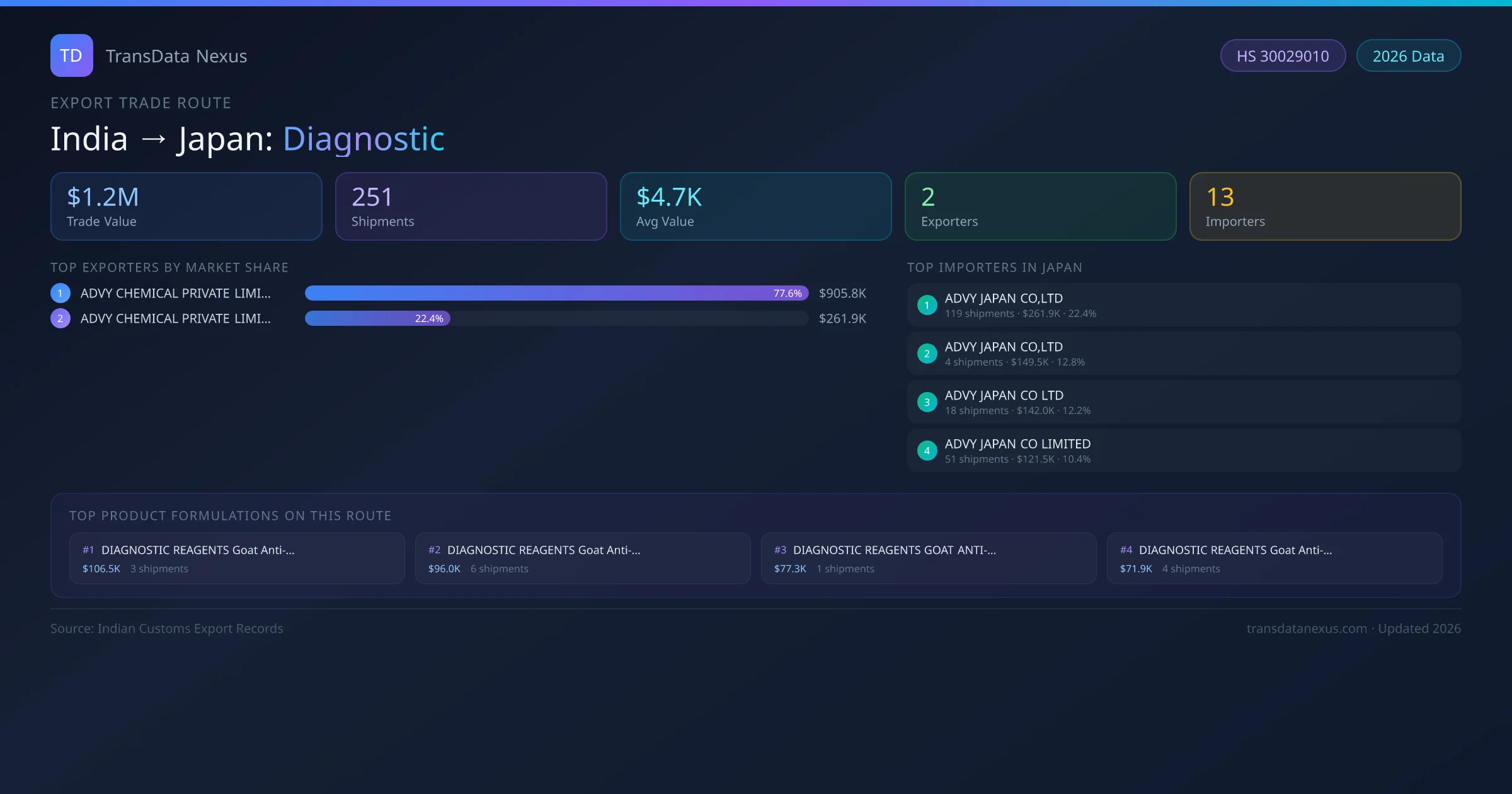 On the buying side, ADVY JAPAN CO,LTD is the largest importer with 119 shipments worth $261.9K USD — representing 22% of all diagnostic imports from India on this route. A total of 13 buyers are active on this corridor.
