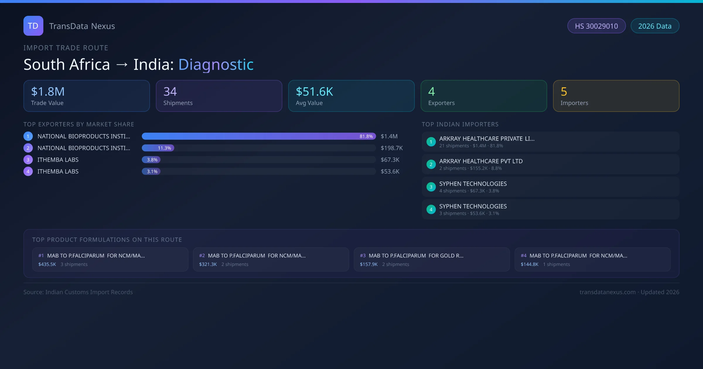 The South Africa to India Diagnostic corridor is one of India's established pharmaceutical import routes from South Africa, with 34 shipments documented worth a combined $1.8M USD. The route is dominated by NATIONAL BIOPRODUCTS INSTITUTE NPC , which alone accounts for roughly 82% of all import value, reflecting the consolidated nature of South Africa's diagnostic export sector.