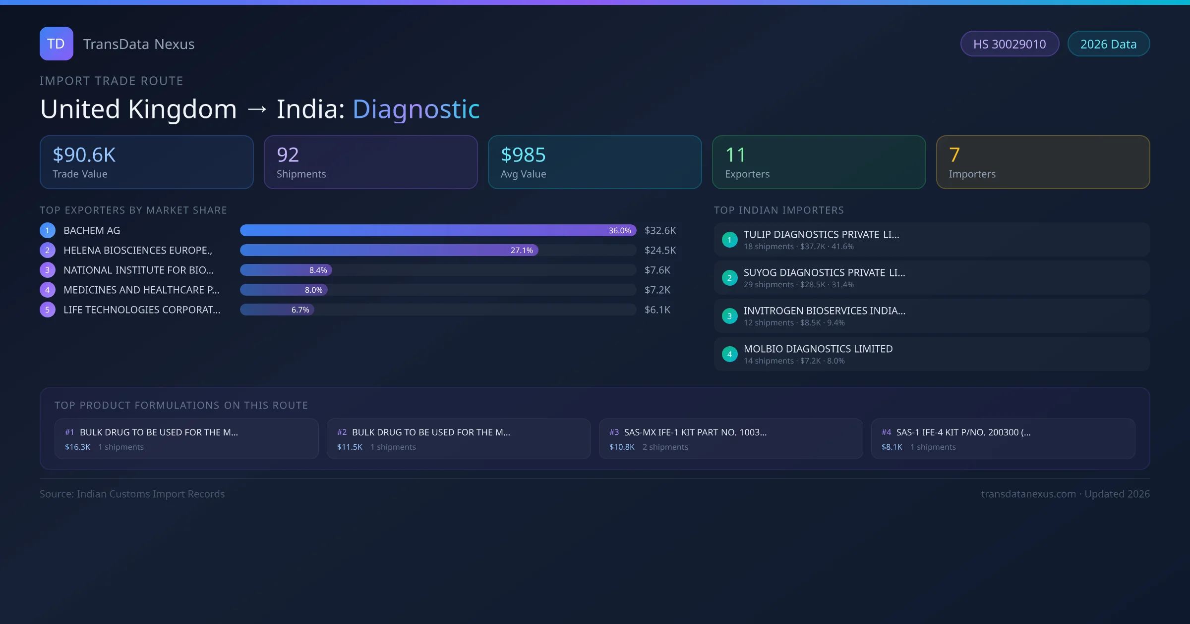 India has recorded 92 verified shipments of Diagnostic imported from United Kingdom, representing a combined trade value of $90.6K USD. This corridor is served by 11 active United Kingdom exporters, with an average shipment value of $985 USD. The leading United Kingdom supplier is BACHEM AG, which accounts for 36% of total import value with 5 shipments worth $32.6K USD. On the buying side, TULIP DIAGNOSTICS PRIVATE LIMITED is the largest Indian importer with $37.7K USD in purchases. The top 3 suppliers — BACHEM AG, HELENA BIOSCIENCES EUROPE.,, NATIONAL INSTITUTE FOR BIOLOGICAL STANDARDS AND CO — together control 71% of total trade value on this route. All data sourced from Indian Customs (DGFT) shipping bill of entry records. Values reported in FOB USD.