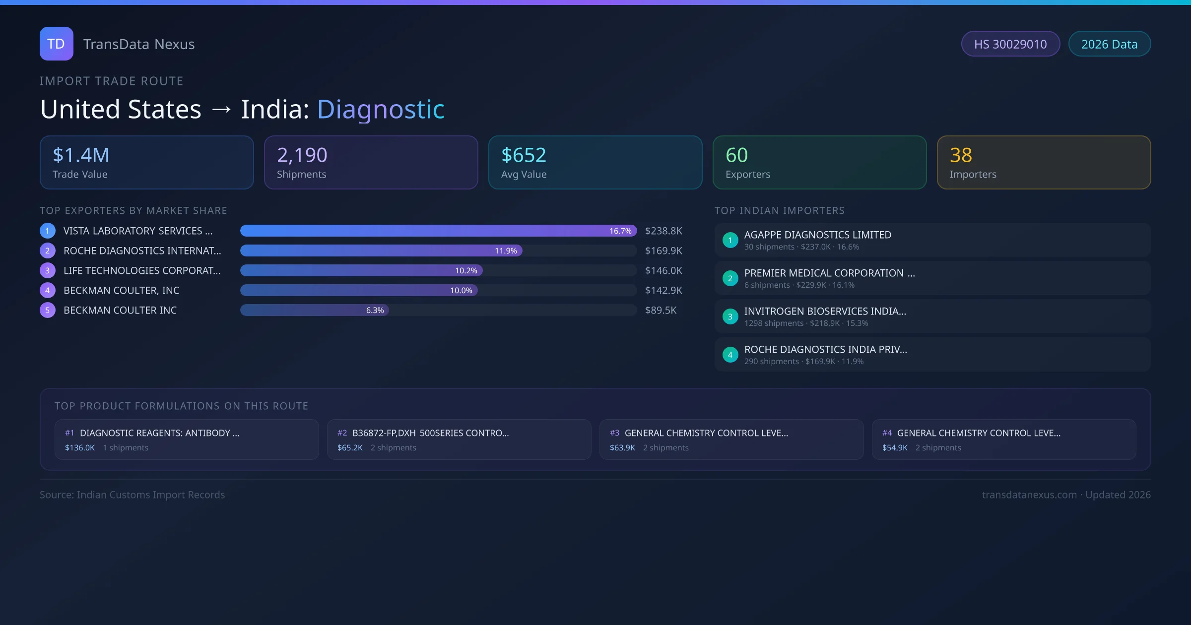 The United States to India Diagnostic corridor is one of India's established pharmaceutical import routes from United States, with 2,190 shipments documented worth a combined $1.4M USD. The route is dominated by VISTA LABORATORY SERVICES LLC, which alone accounts for roughly 17% of all import value, reflecting the consolidated nature of United States's diagnostic export sector.
