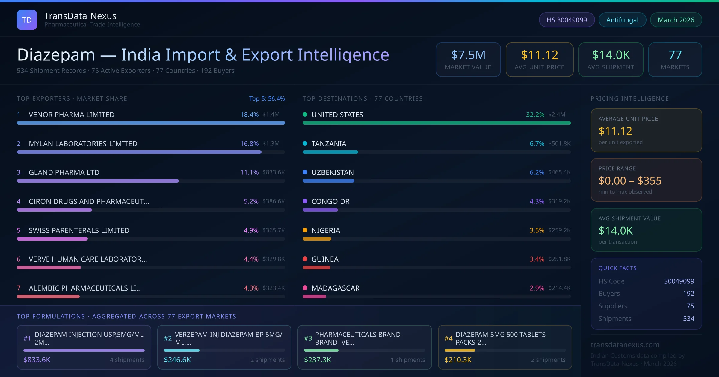 The total export value of diazepam from India is $7.5M, recorded across 534 shipments from 75 active exporters to 77 countries. The average shipment value is $14.0K.