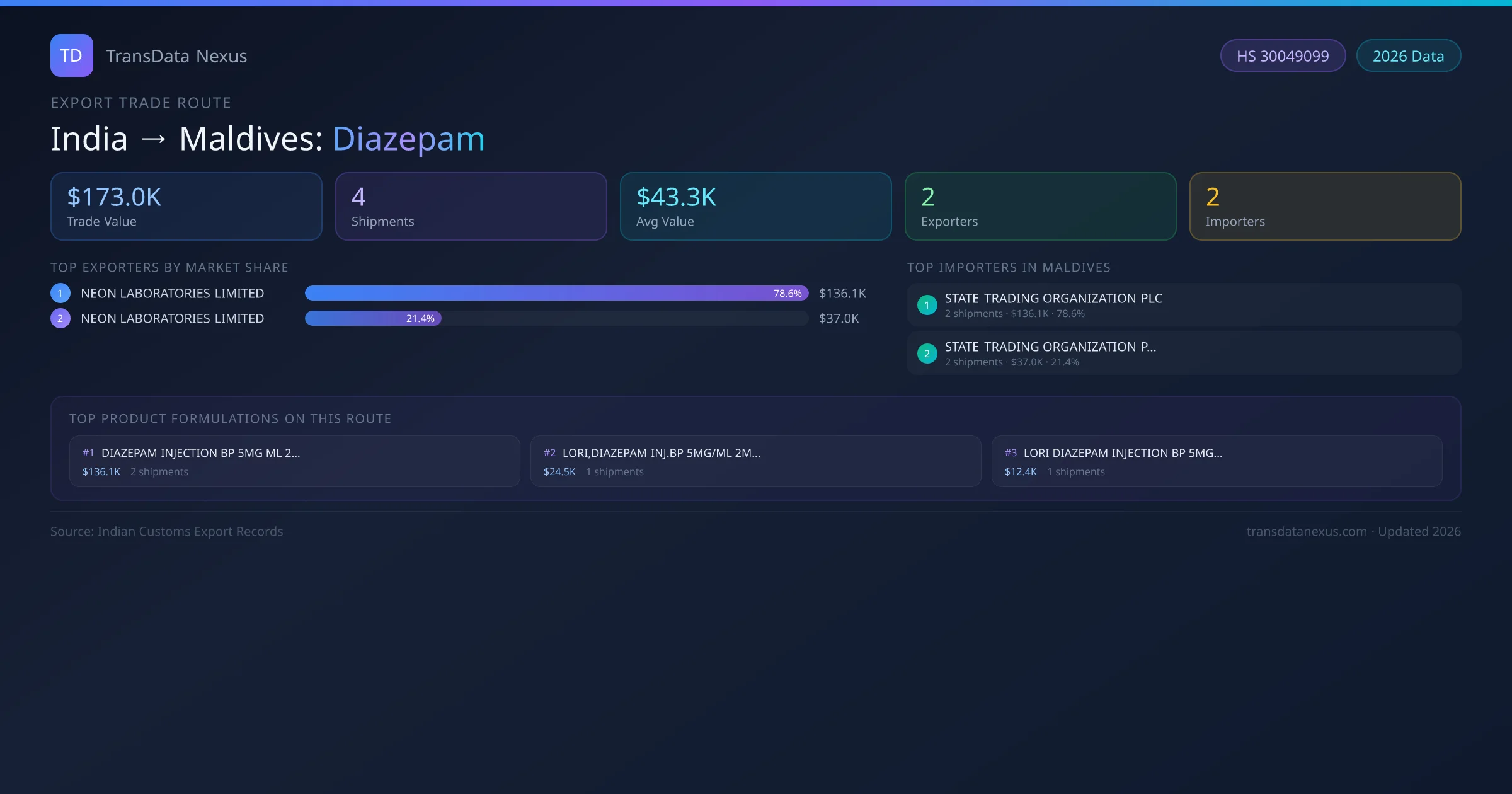 India has recorded 4 verified shipments of Diazepam exported to Maldives, representing a combined trade value of $173.0K USD. This corridor is served by 2 active Indian exporters, with an average shipment value of $43.3K USD. The leading Indian exporter is NEON LABORATORIES LIMITED, which accounts for 79% of total export value with 2 shipments worth $136.1K USD. On the buying side, STATE TRADING ORGANIZATION PLC is the largest importer in Maldives with $136.1K USD in purchases. All data sourced from Indian Customs (DGFT) shipping bill records. Values reported in FOB USD.