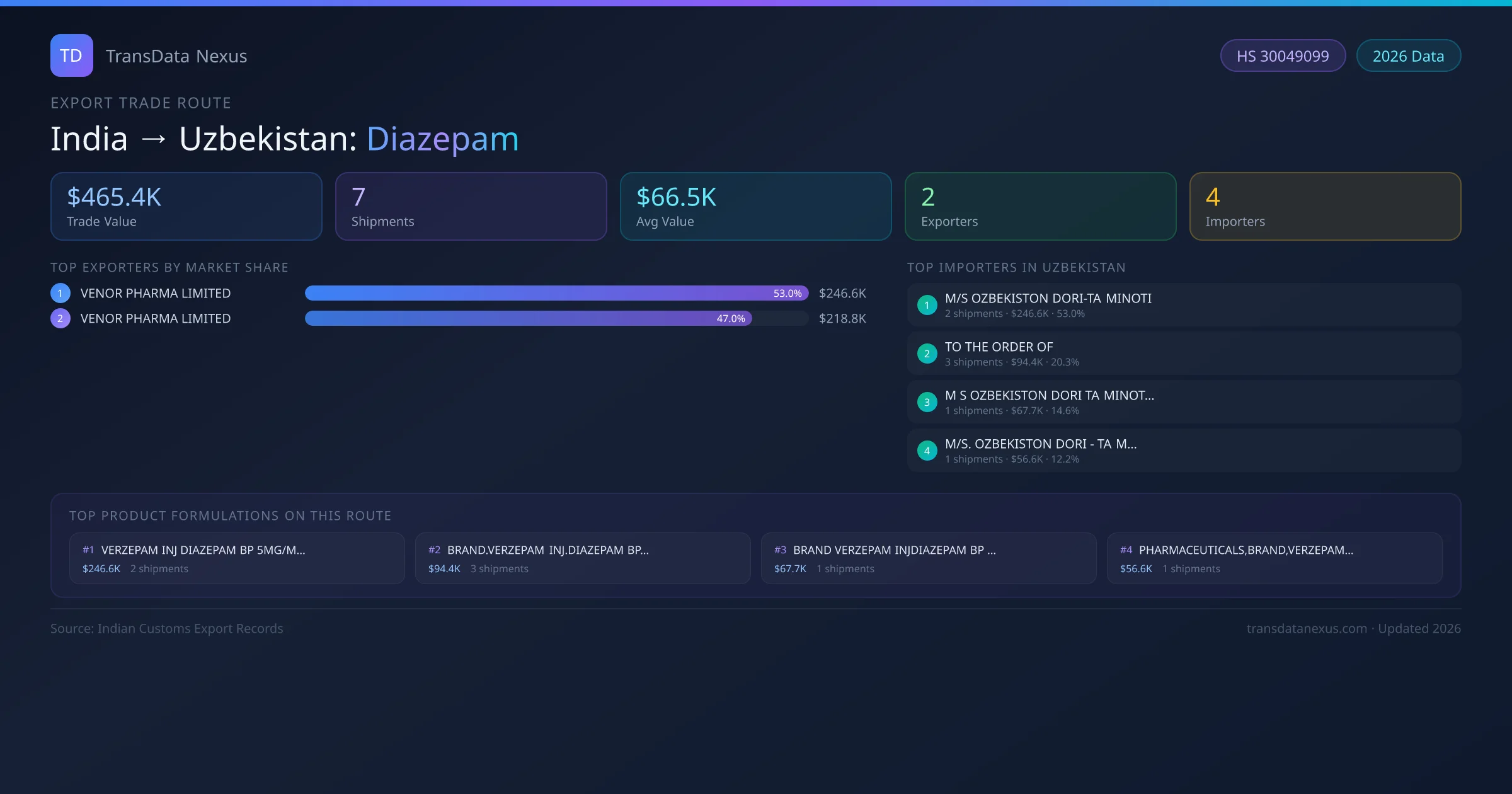 The India to Uzbekistan Diazepam corridor is one of India's established pharmaceutical export routes, with 7 shipments documented worth a combined $465.4K USD. The route is dominated by VENOR PHARMA LIMITED , which alone accounts for roughly 53% of all export value, reflecting the consolidated nature of India's diazepam manufacturing sector.