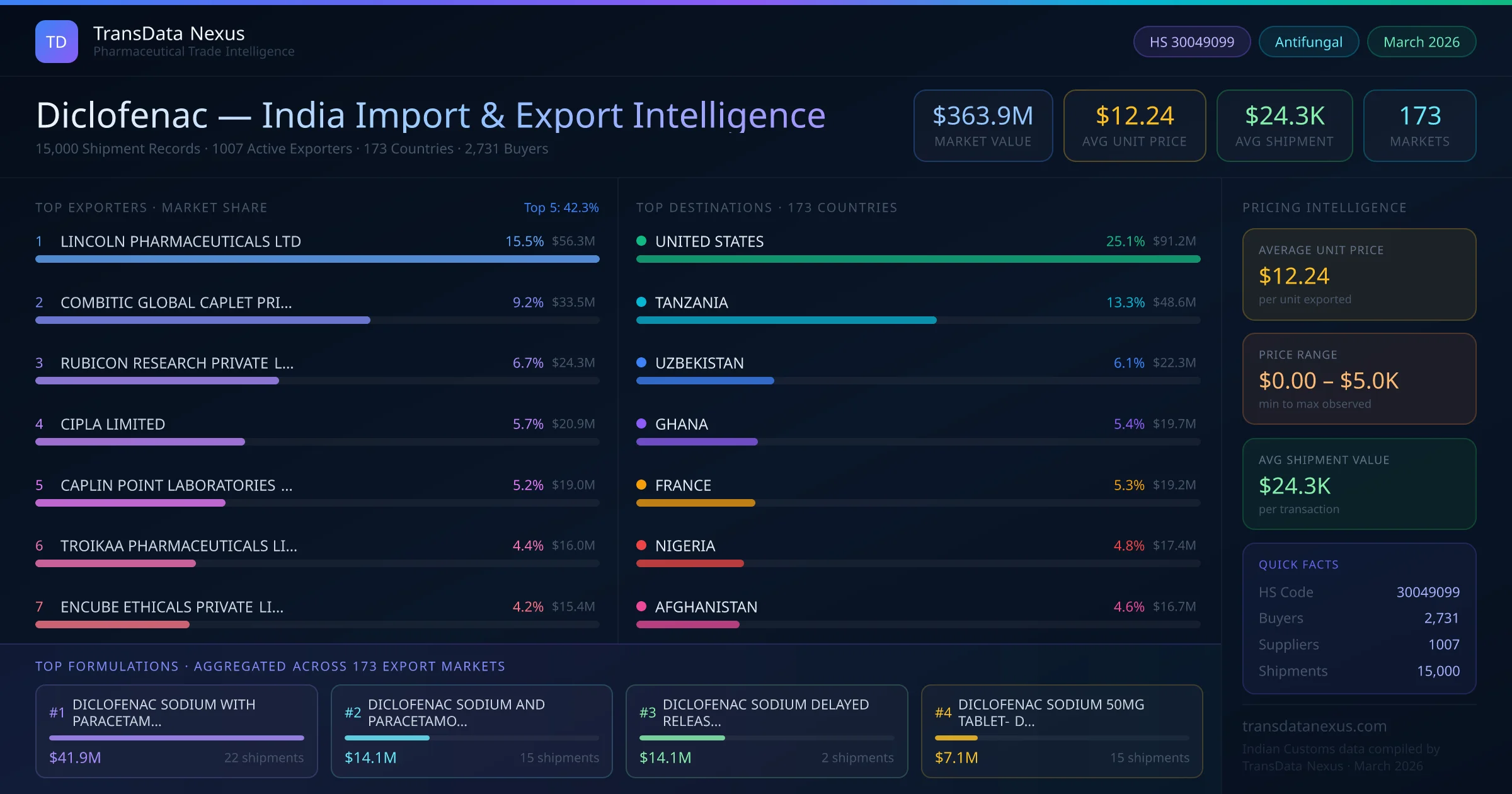 Between 2022 and 2026, India exported $363.9M worth of diclofenac across 15,000 verified shipments to 173 countries — covering 89% of world markets in the Analgesics & Antipyretics segment. The largest destination is UNITED STATES (25.1%). LINCOLN PHARMACEUTICALS LTD leads with a 15.5% share. All figures are drawn from Indian Customs (DGFT) shipping bill records spanning four years of trade activity.