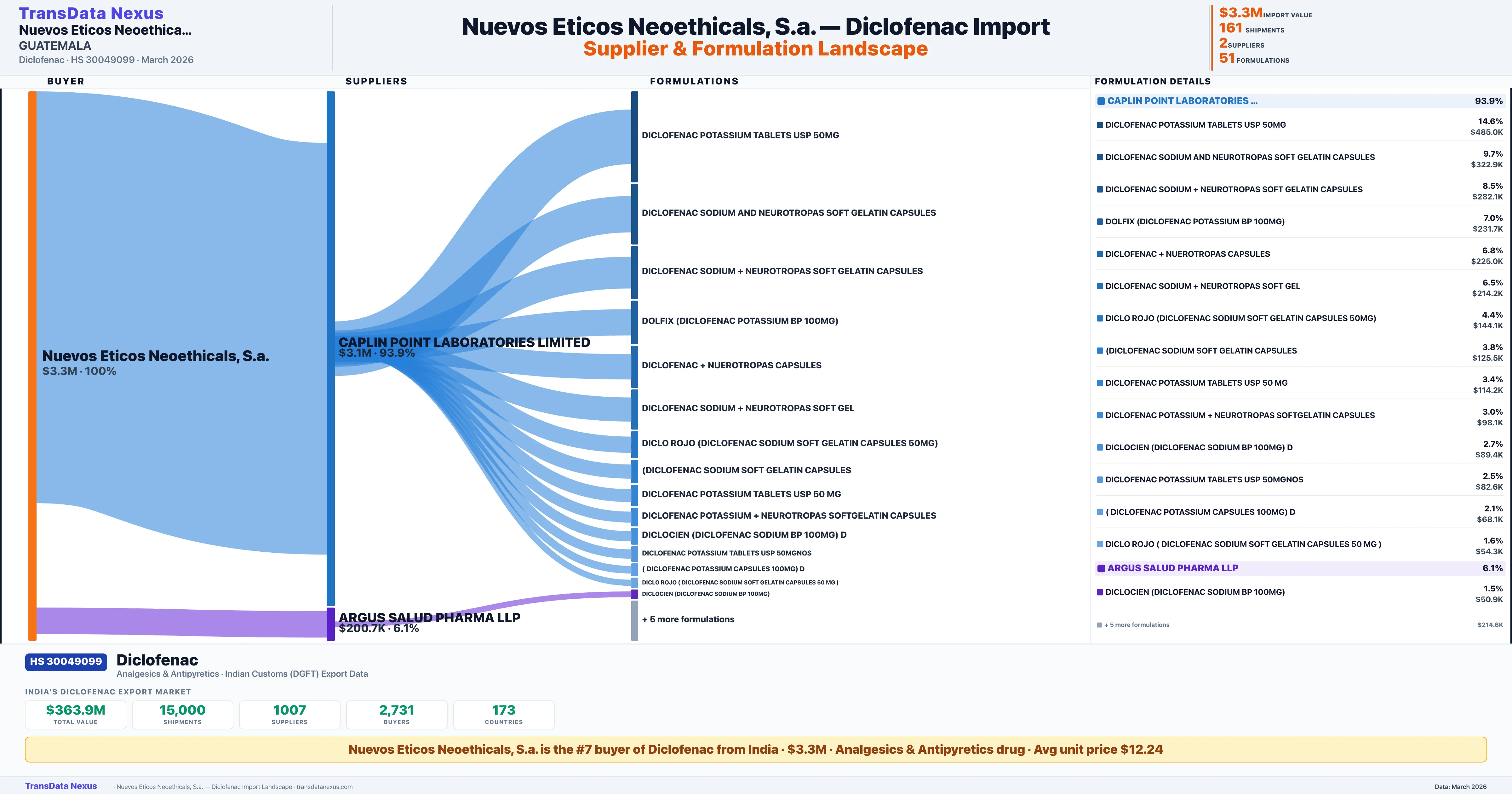 NUEVOS ETICOS NEOETHICALS, S.A. sources Diclofenac from 2 verified Indian suppliers based on 161 customs records. The primary supplier is CAPLIN POINT LABORATORIES LIMITED accounting for 93.9% of imports.