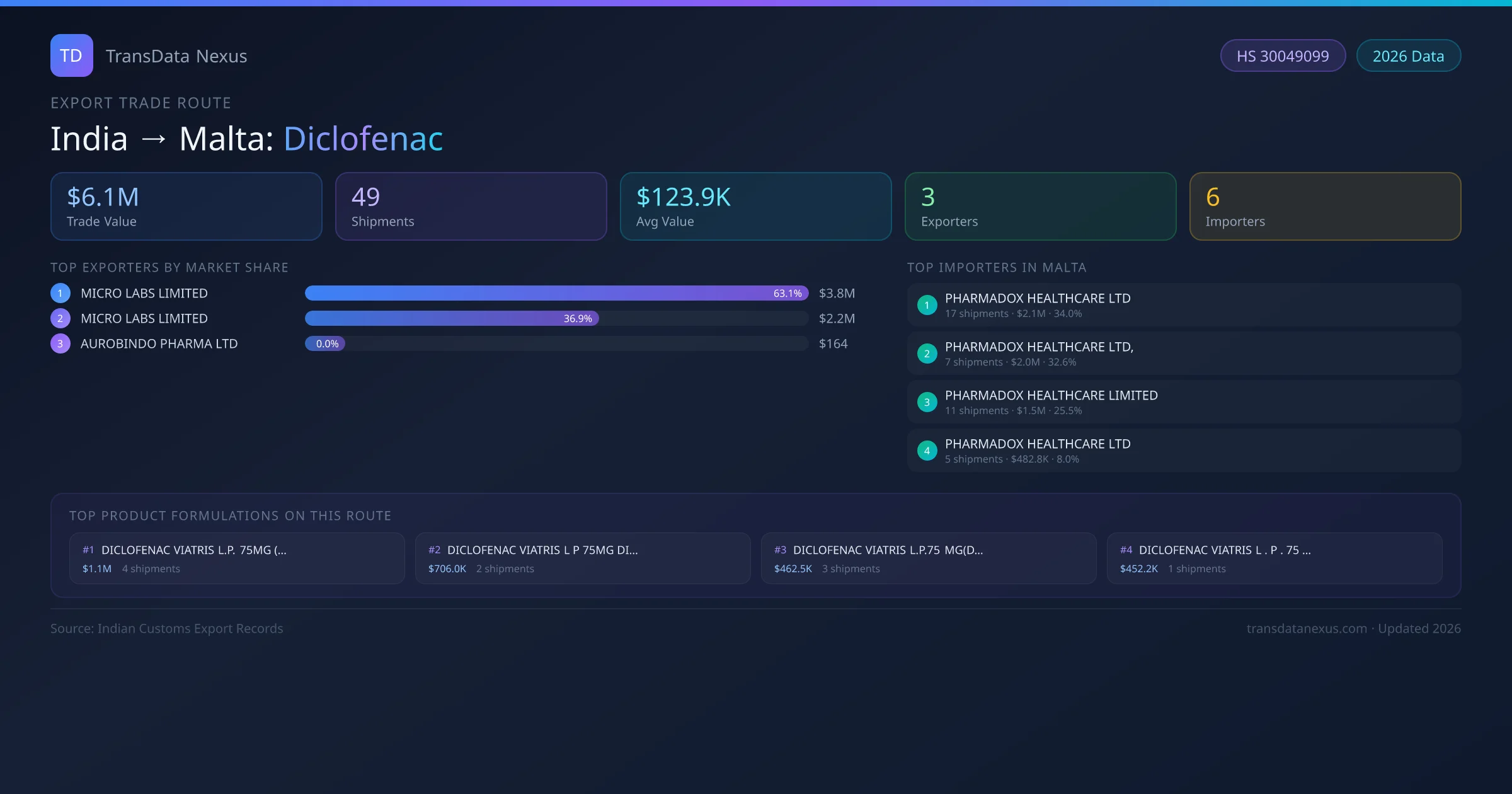 India has recorded 49 verified shipments of Diclofenac exported to Malta, representing a combined trade value of $6.1M USD. This corridor is served by 3 active Indian exporters, with an average shipment value of $123.9K USD. The leading Indian exporter is MICRO LABS LIMITED, which accounts for 63% of total export value with 31 shipments worth $3.8M USD. On the buying side, PHARMADOX HEALTHCARE LTD is the largest importer in Malta with $2.1M USD in purchases. The top 3 suppliers — MICRO LABS LIMITED, MICRO LABS LIMITED , AUROBINDO PHARMA LTD — together control 100% of total trade value on this route. All data sourced from Indian Customs (DGFT) shipping bill records. Values reported in FOB USD.