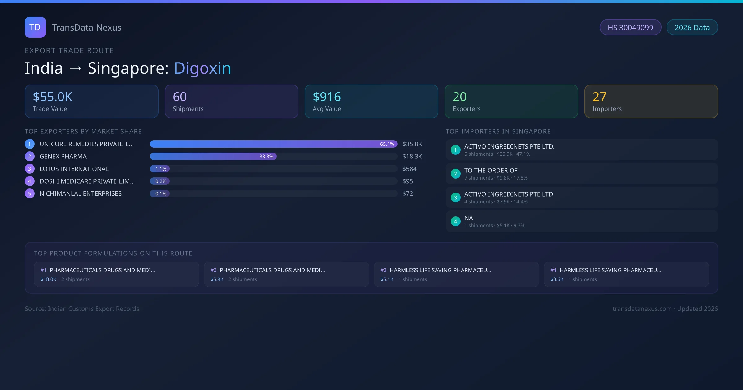 The India to Singapore Digoxin corridor is one of India's established pharmaceutical export routes, with 60 shipments documented worth a combined $55.0K USD. The route is dominated by UNICURE REMEDIES PRIVATE LIMITED, which alone accounts for roughly 65% of all export value, reflecting the consolidated nature of India's digoxin manufacturing sector.