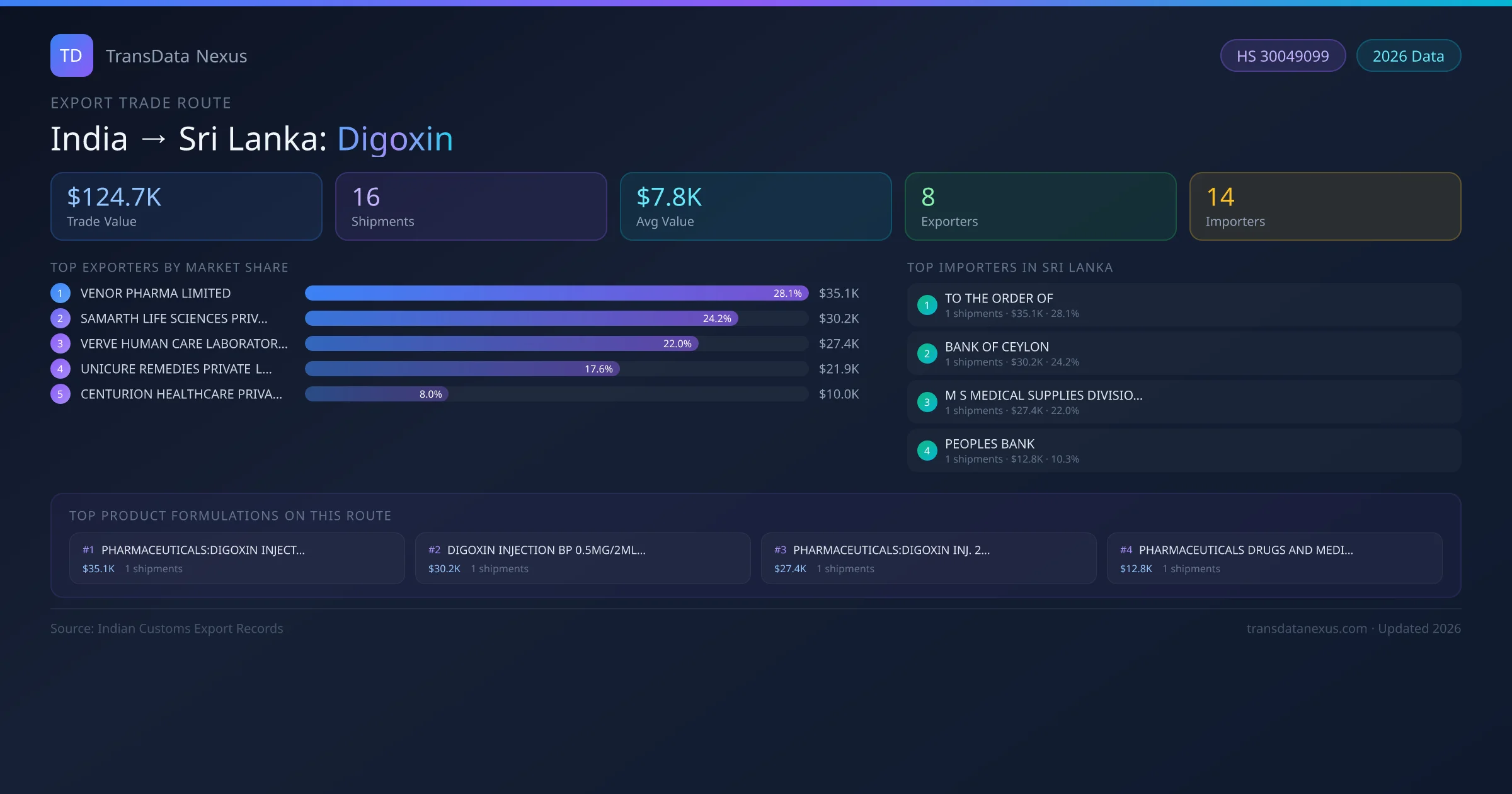 - 1.Route Identification: India to Sri Lanka export trade corridor identified from Indian Customs (DGFT) records for Digoxin.