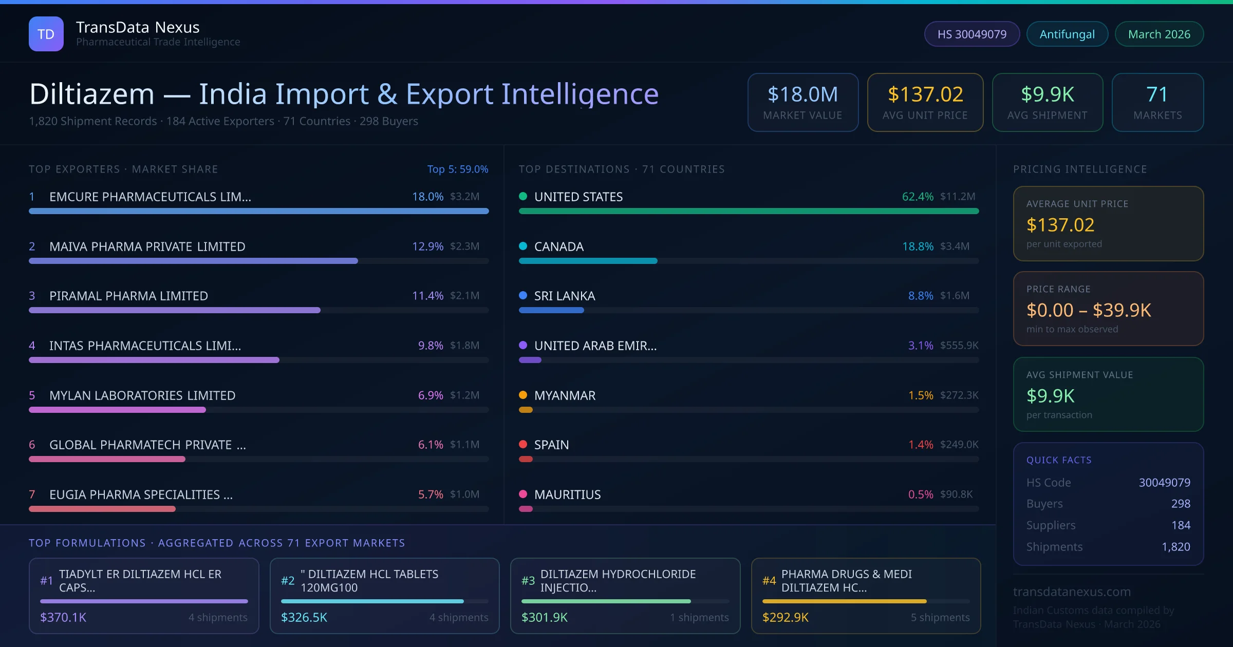 The total export value of diltiazem from India is $18.0M, recorded across 1,820 shipments from 184 active exporters to 71 countries. The average shipment value is $9.9K.