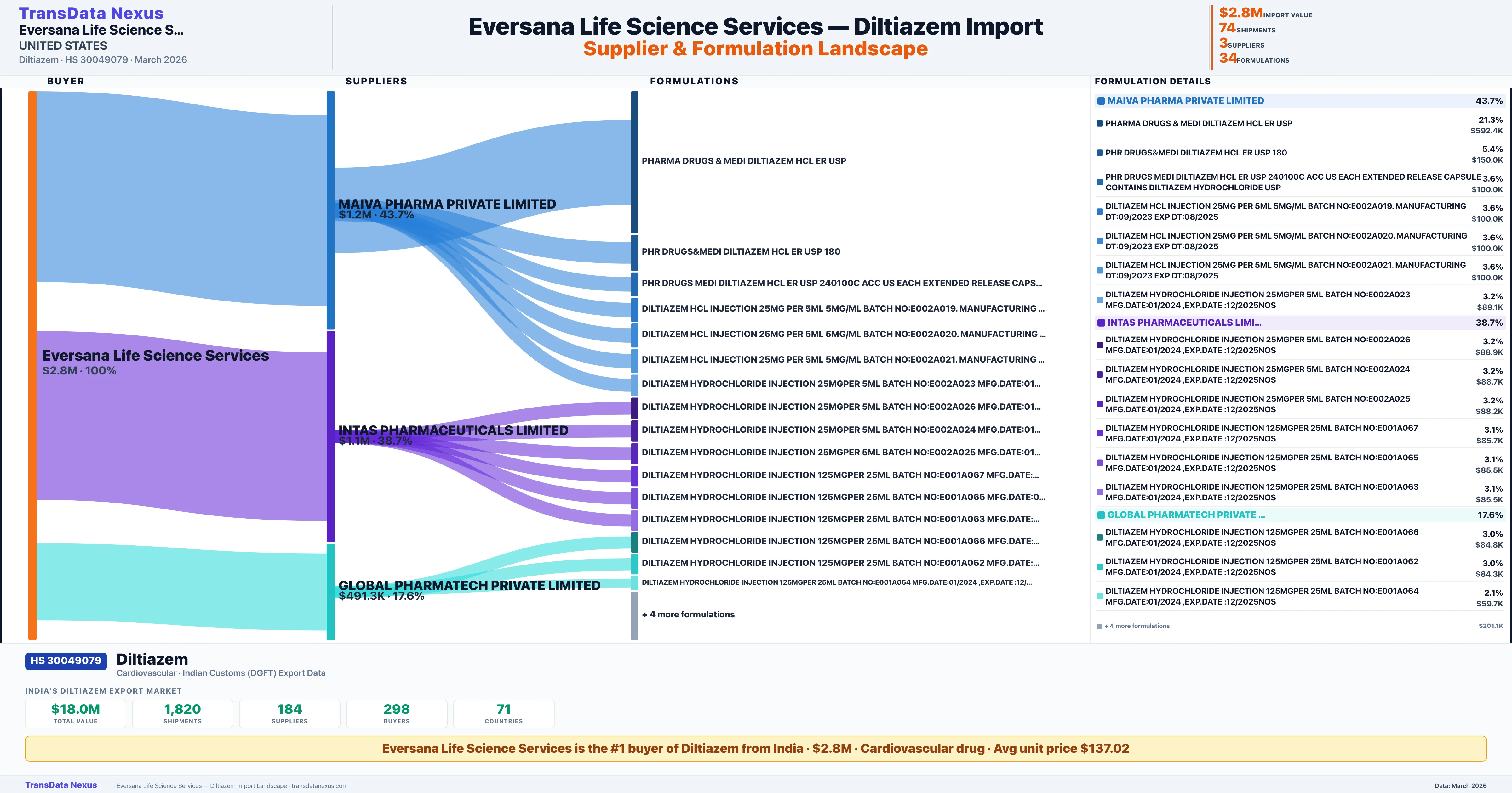 EVERSANA LIFE SCIENCE SERVICES sources Diltiazem from 3 verified Indian suppliers: MAIVA PHARMA PRIVATE LIMITED ($1.2M, 43.7%), INTAS PHARMACEUTICALS LIMITED ($1.1M, 38.7%), GLOBAL PHARMATECH PRIVATE LIMITED ($491.3K, 17.6%). This is based on 74 customs records.