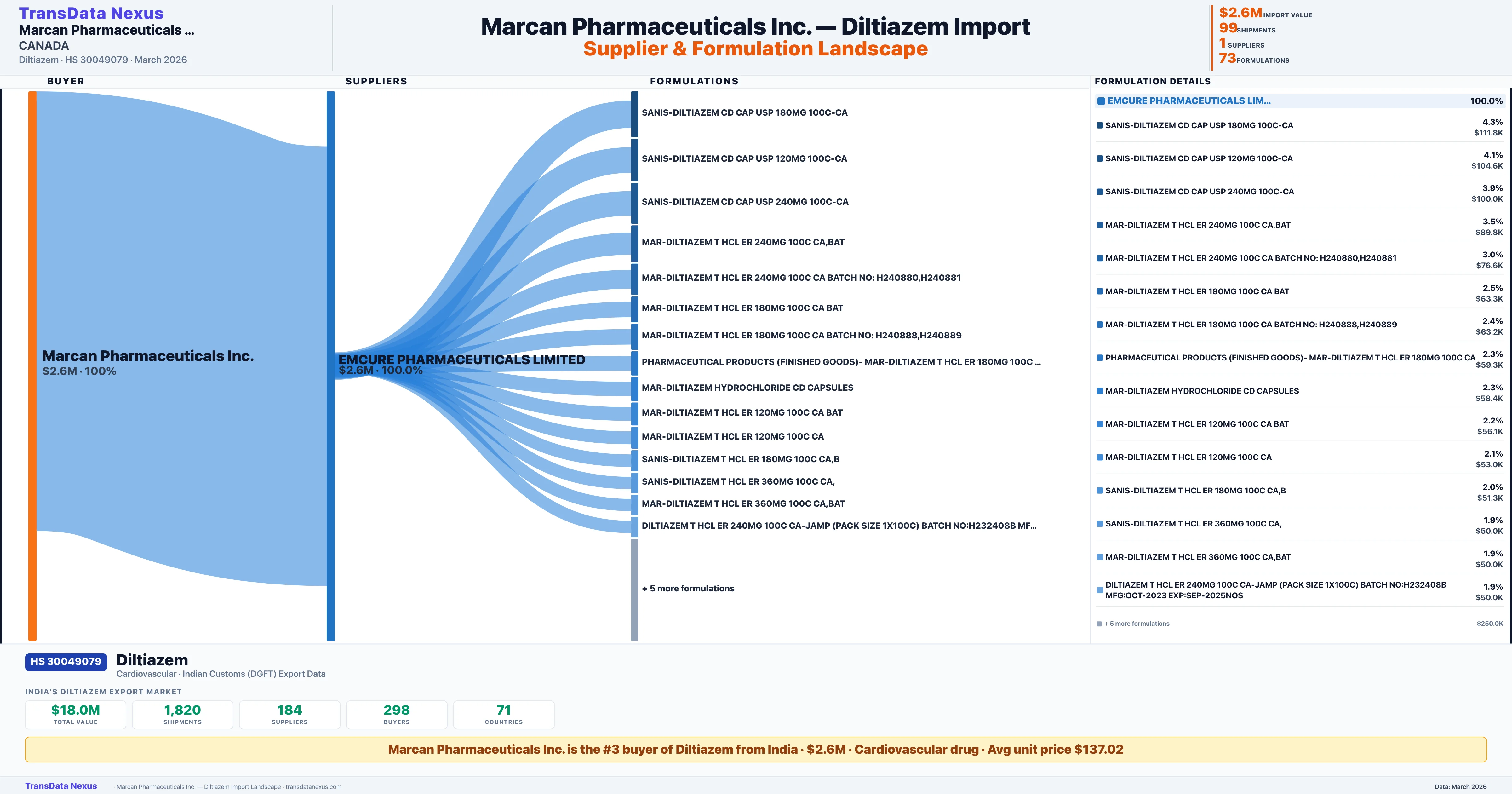 MARCAN PHARMACEUTICALS INC. sources Diltiazem from 1 verified Indian supplier: EMCURE PHARMACEUTICALS LIMITED ($2.6M, 100.0%). This is based on 99 customs records.