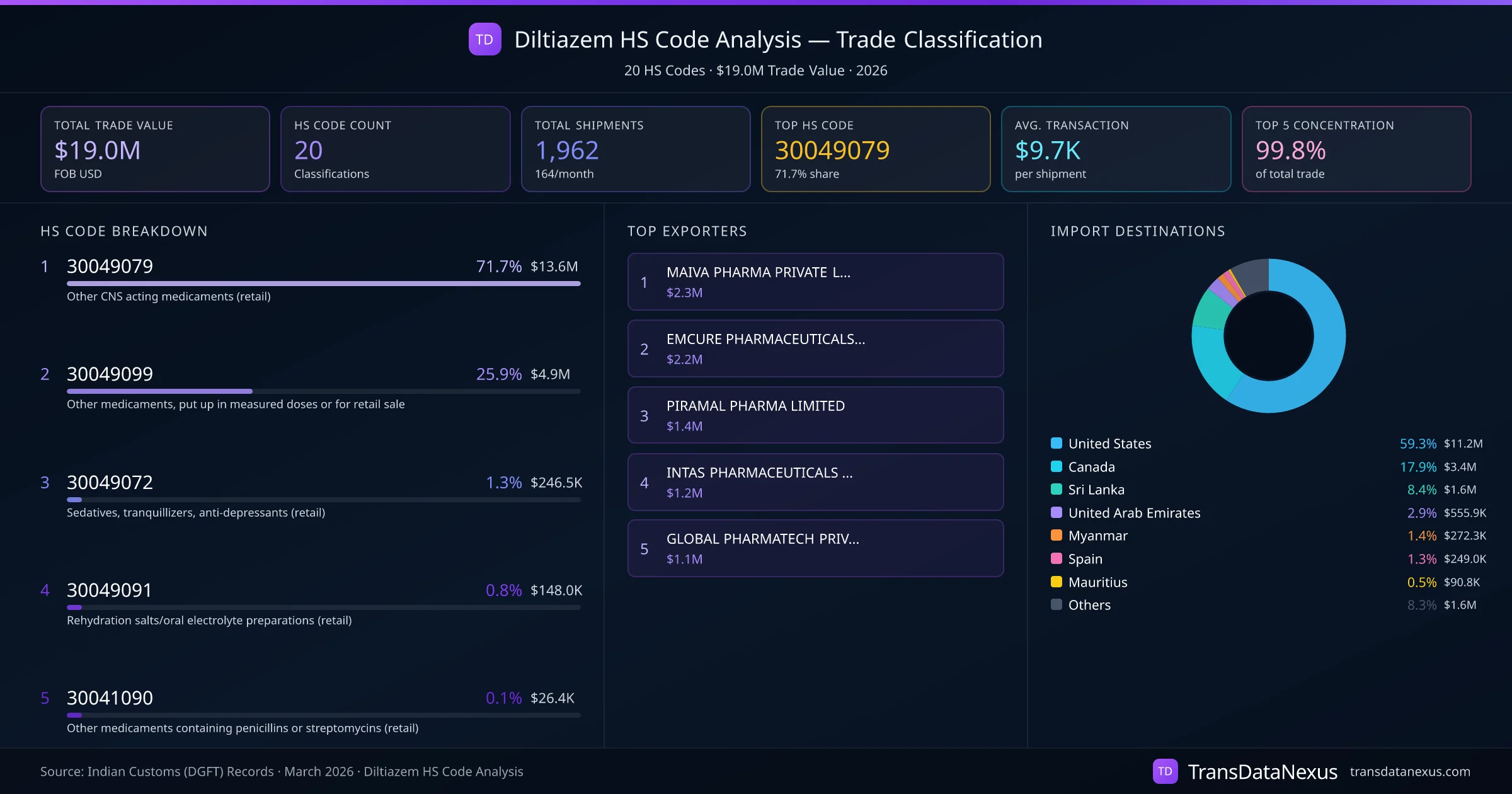 India exports Diltiazem under 20 distinct HS code classifications, representing a total trade value of $19.0M across 1,962 shipments. The dominant classification is HS 30049079 (Other CNS acting medicaments (retail)), accounting for 71.7% of all Diltiazem trade at $13.6M. HS 30049099 (Other medicaments, put up in measured doses or for retail sale) follows at 25.9% ($4.9M). The top 5 HS codes together account for 99.8% of total Diltiazem trade from India. The average transaction value is $9666. Key importing markets include United States, Canada, Sri Lanka. Leading exporters include MAIVA PHARMA PRIVATE LIMITED and EMCURE PHARMACEUTICALS LIMITED. Data sourced from Indian Customs (DGFT) shipping bill records.