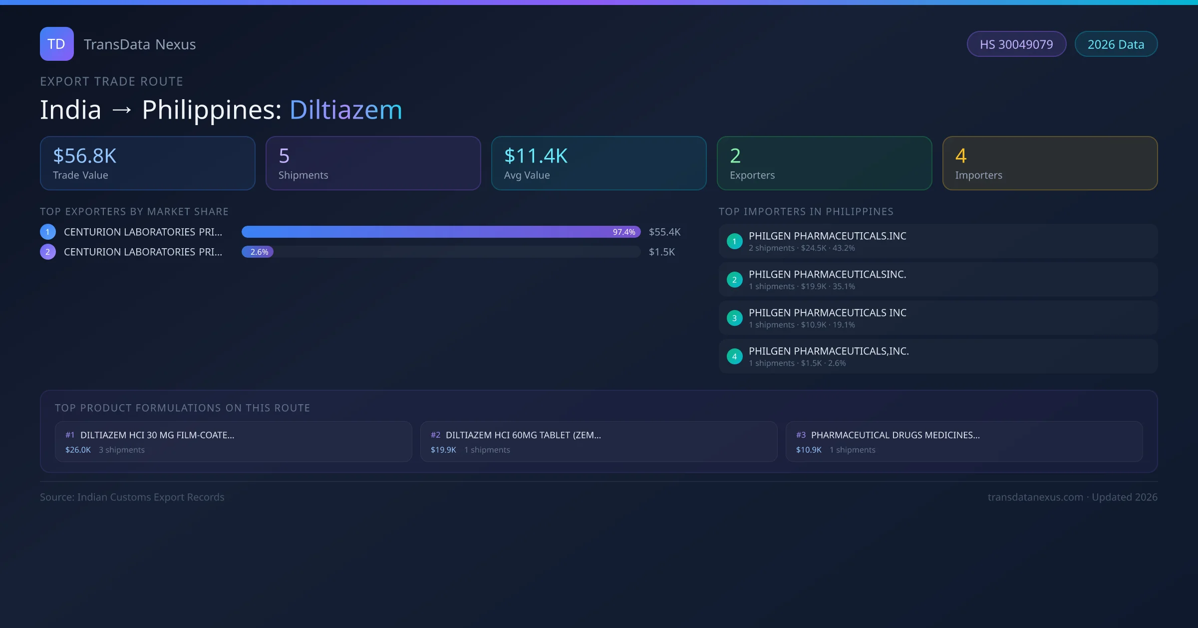 The India to Philippines Diltiazem corridor is one of India's established pharmaceutical export routes, with 5 shipments documented worth a combined $56.8K USD. The route is dominated by CENTURION LABORATORIES PRIVATE LIMITED, which alone accounts for roughly 97% of all export value, reflecting the consolidated nature of India's diltiazem manufacturing sector.