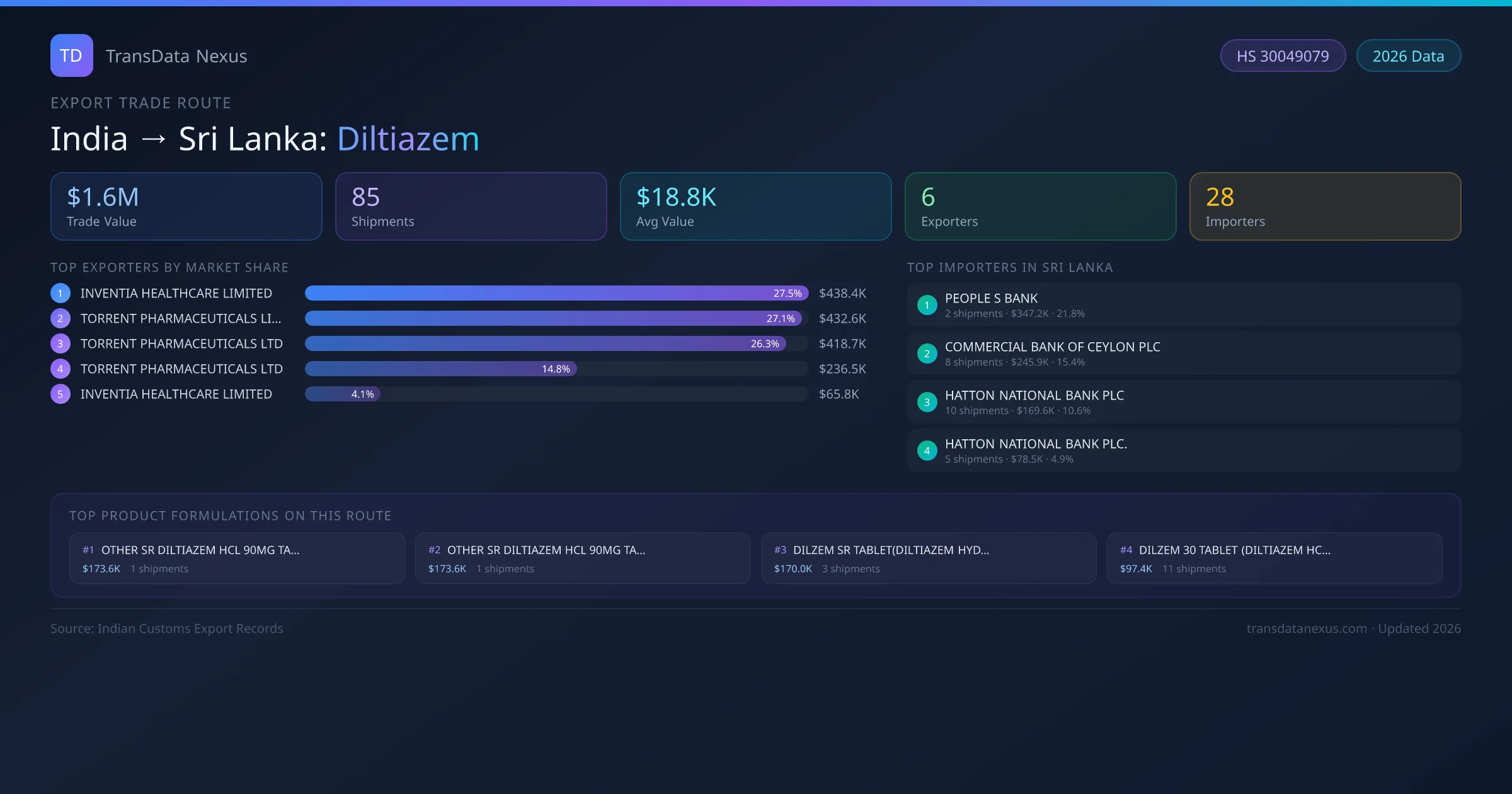 - 1.Route Identification: India to Sri Lanka export trade corridor identified from Indian Customs (DGFT) records for Diltiazem.