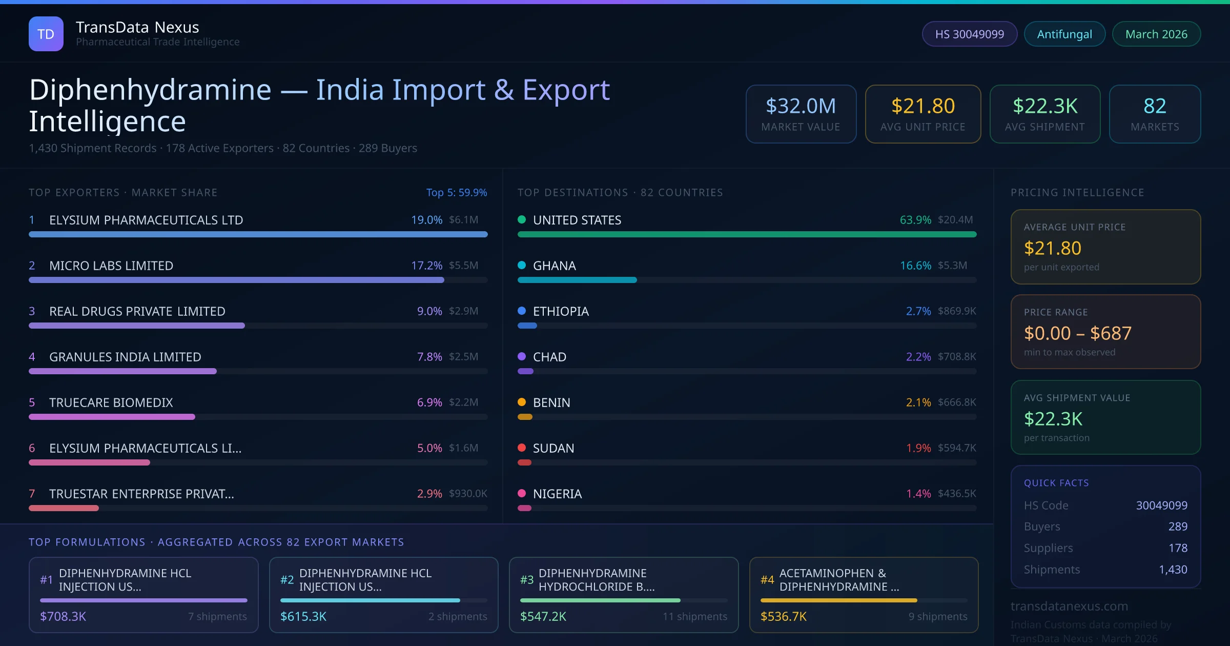 The total export value of diphenhydramine from India is $32.0M, recorded across 1,430 shipments from 178 active exporters to 82 countries. The average shipment value is $22.3K.