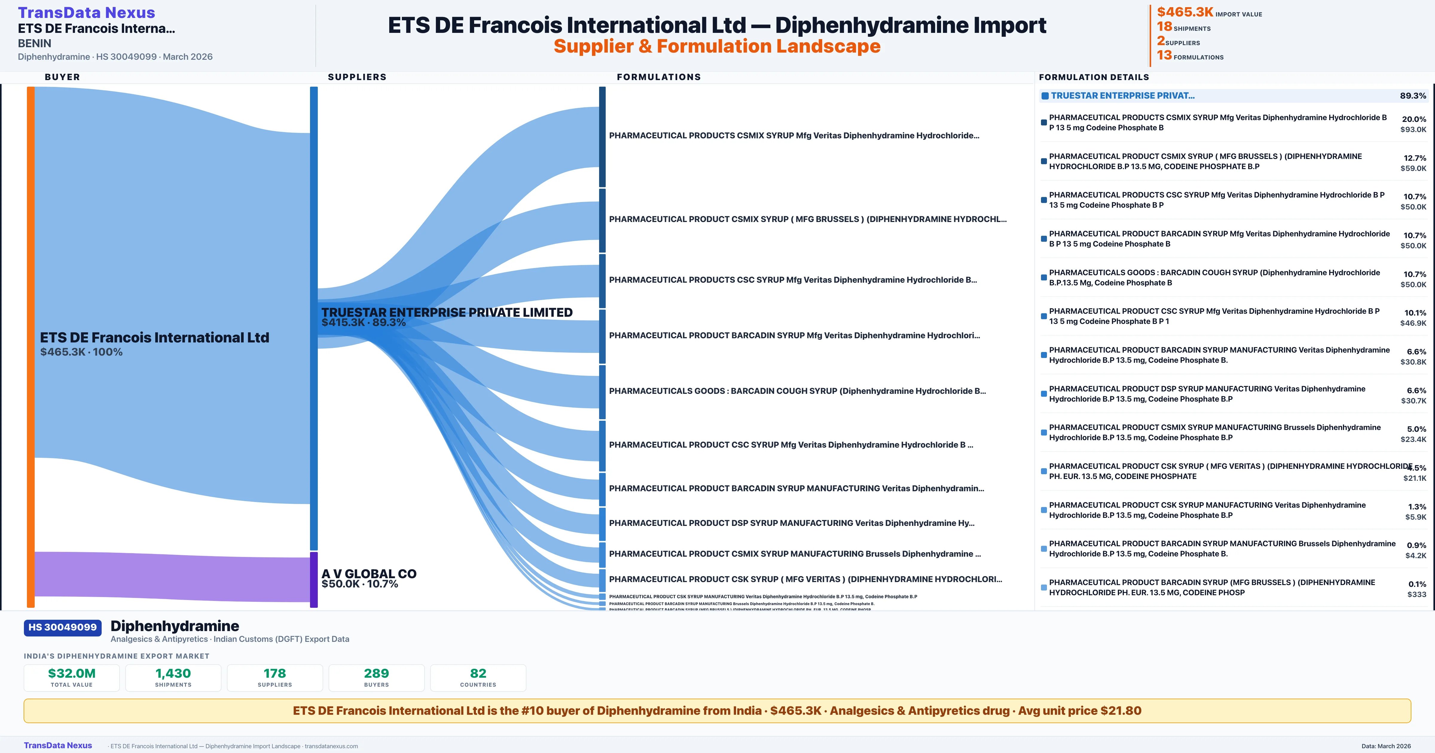 ETS DE FRANCOIS INTERNATIONAL LTD sources Diphenhydramine from 2 verified Indian suppliers based on 18 customs records. The primary supplier is TRUESTAR ENTERPRISE PRIVATE LIMITED accounting for 89.3% of imports.