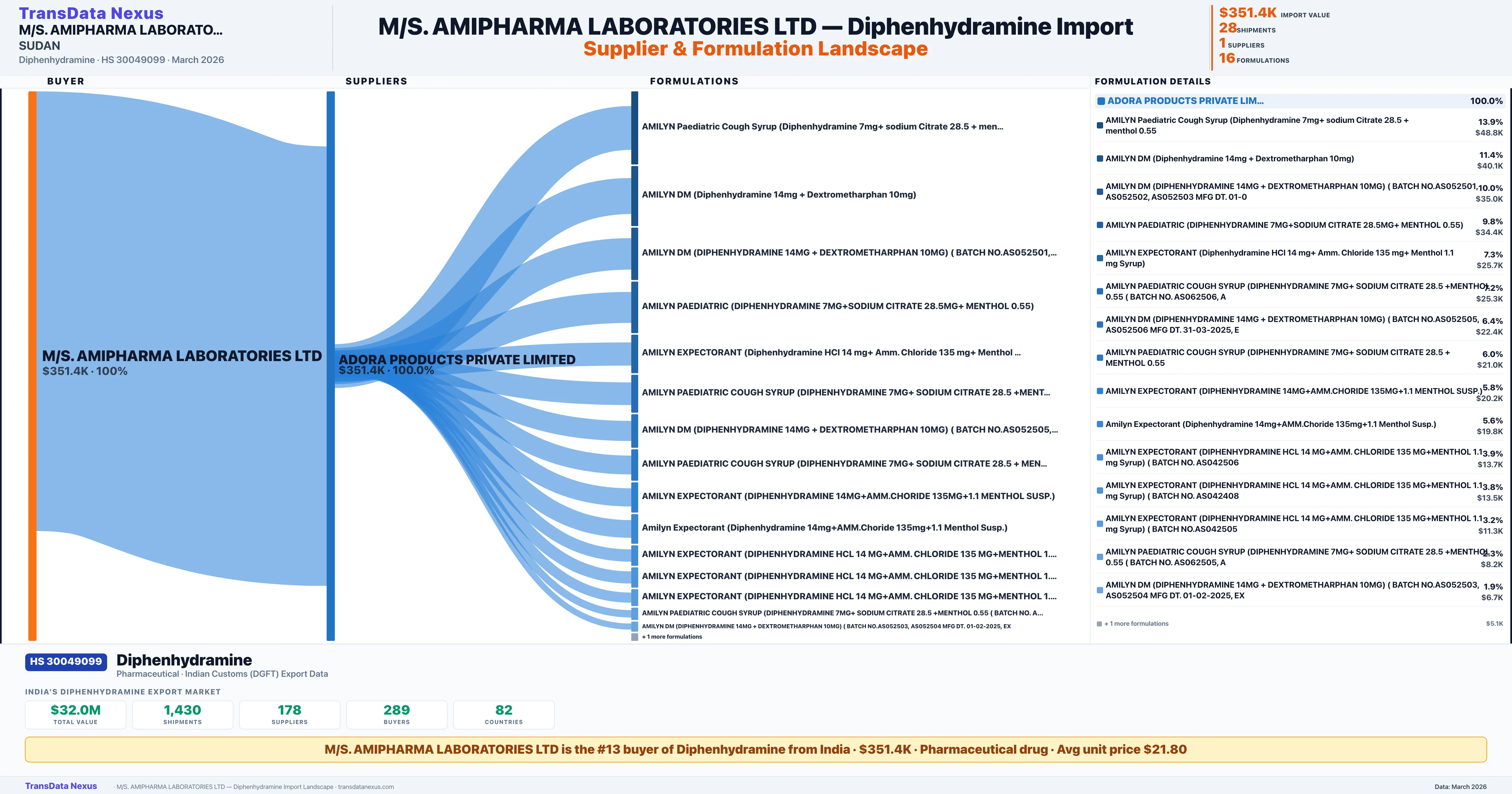 M/S. AMIPHARMA LABORATORIES LTD is the #13 importer of Diphenhydramine from India with $351.4K in import value and 28 verified shipments. M/S. AMIPHARMA LABORATORIES LTD holds a 1.1% market share in Diphenhydramine imports based in SUDAN. The company sources from 1 verified supplier across 16 formulations shipped to 1 country.