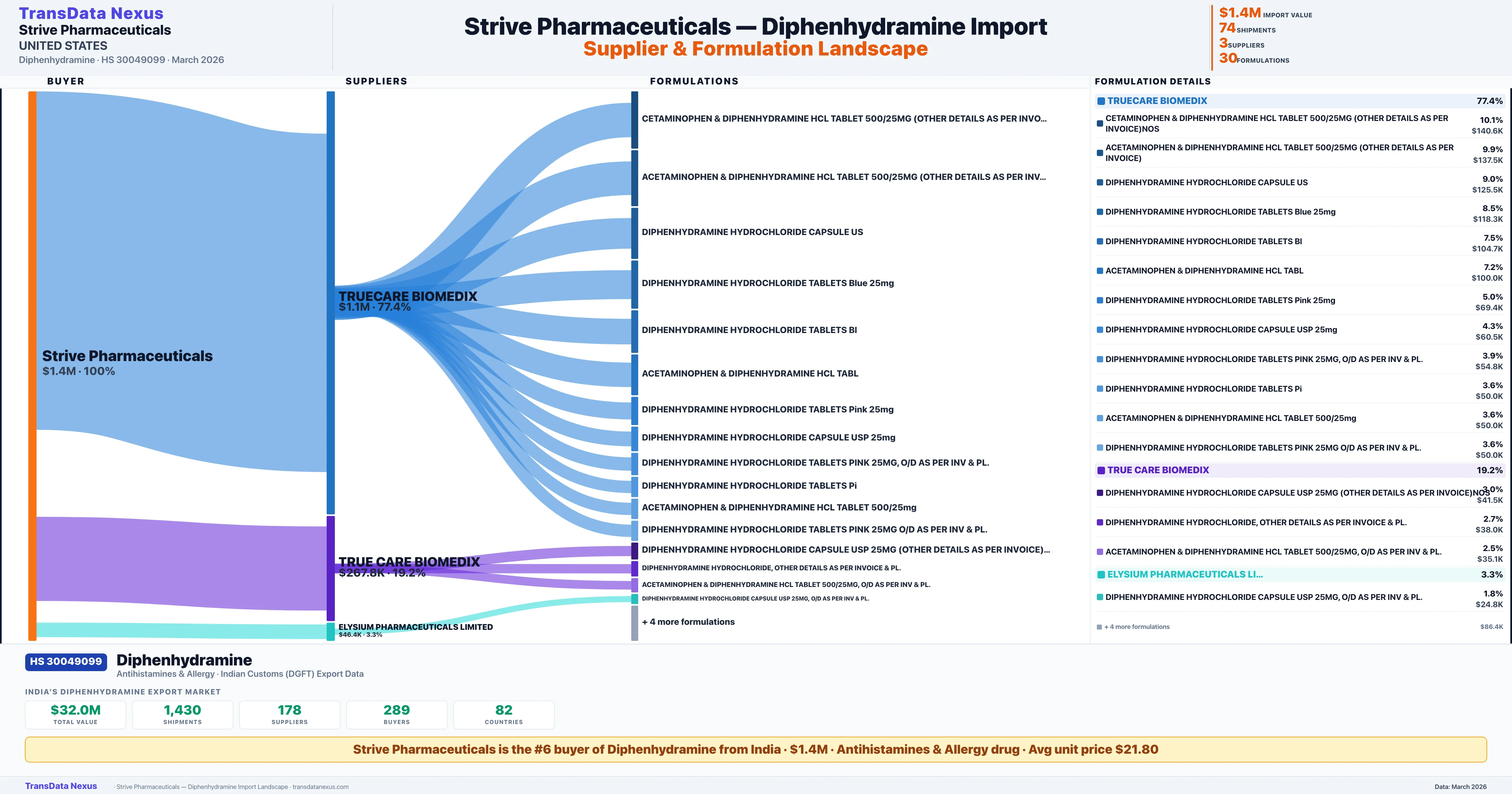 STRIVE PHARMACEUTICALS sources Diphenhydramine from 3 verified Indian suppliers: TRUECARE BIOMEDIX ($1.1M, 77.4%), TRUE CARE BIOMEDIX ($267.8K, 19.2%), ELYSIUM PHARMACEUTICALS LIMITED ($46.4K, 3.3%). This is based on 74 customs records.