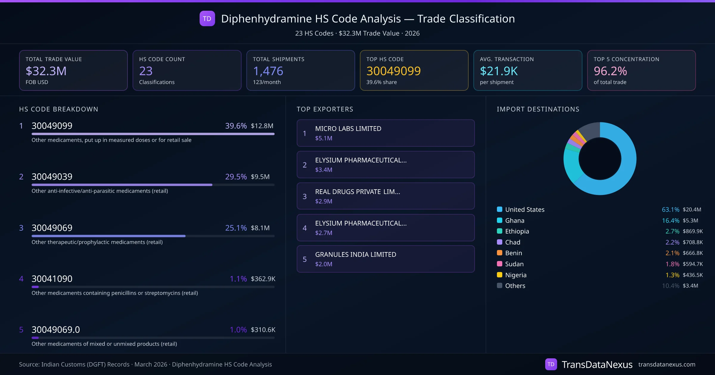 India exports Diphenhydramine under 23 distinct HS code classifications, representing a total trade value of $32.3M across 1,476 shipments. The dominant classification is HS 30049099 (Other medicaments, put up in measured doses or for retail sale), accounting for 39.6% of all Diphenhydramine trade at $12.8M. HS 30049039 (Other anti-infective/anti-parasitic medicaments (retail)) follows at 29.5% ($9.5M). The top 5 HS codes together account for 96.2% of total Diphenhydramine trade from India. The average transaction value is $21916. Key importing markets include United States, Ghana, Ethiopia. Leading exporters include MICRO LABS LIMITED and ELYSIUM PHARMACEUTICALS LTD. Data sourced from Indian Customs (DGFT) shipping bill records.