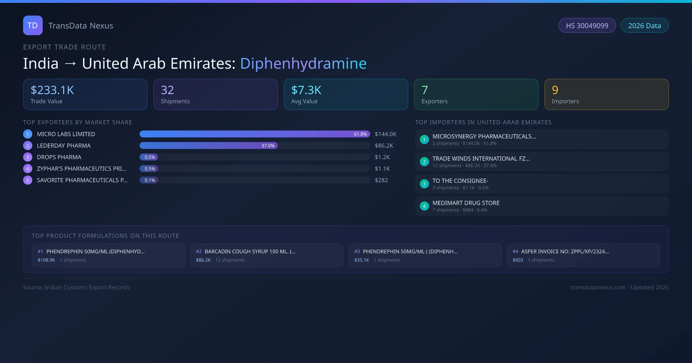 The India to United Arab Emirates Diphenhydramine corridor is one of India's established pharmaceutical export routes, with 32 shipments documented worth a combined $233.1K USD. The route is dominated by MICRO LABS LIMITED, which alone accounts for roughly 62% of all export value, reflecting the consolidated nature of India's diphenhydramine manufacturing sector.