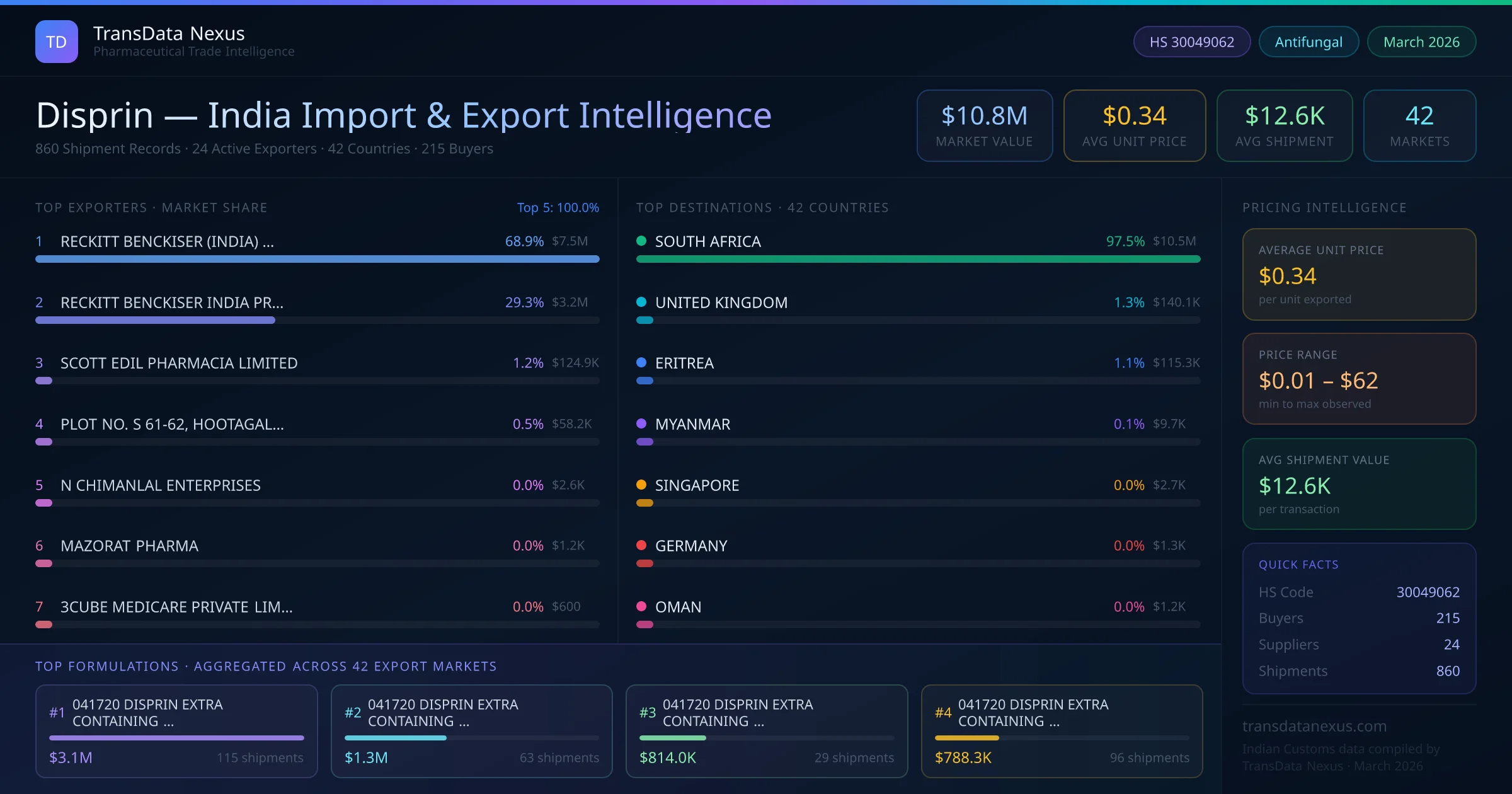The average unit price for disprin exports from India is $0.34 per unit, with prices ranging from $0.01 to $62.27 depending on formulation and order volume.