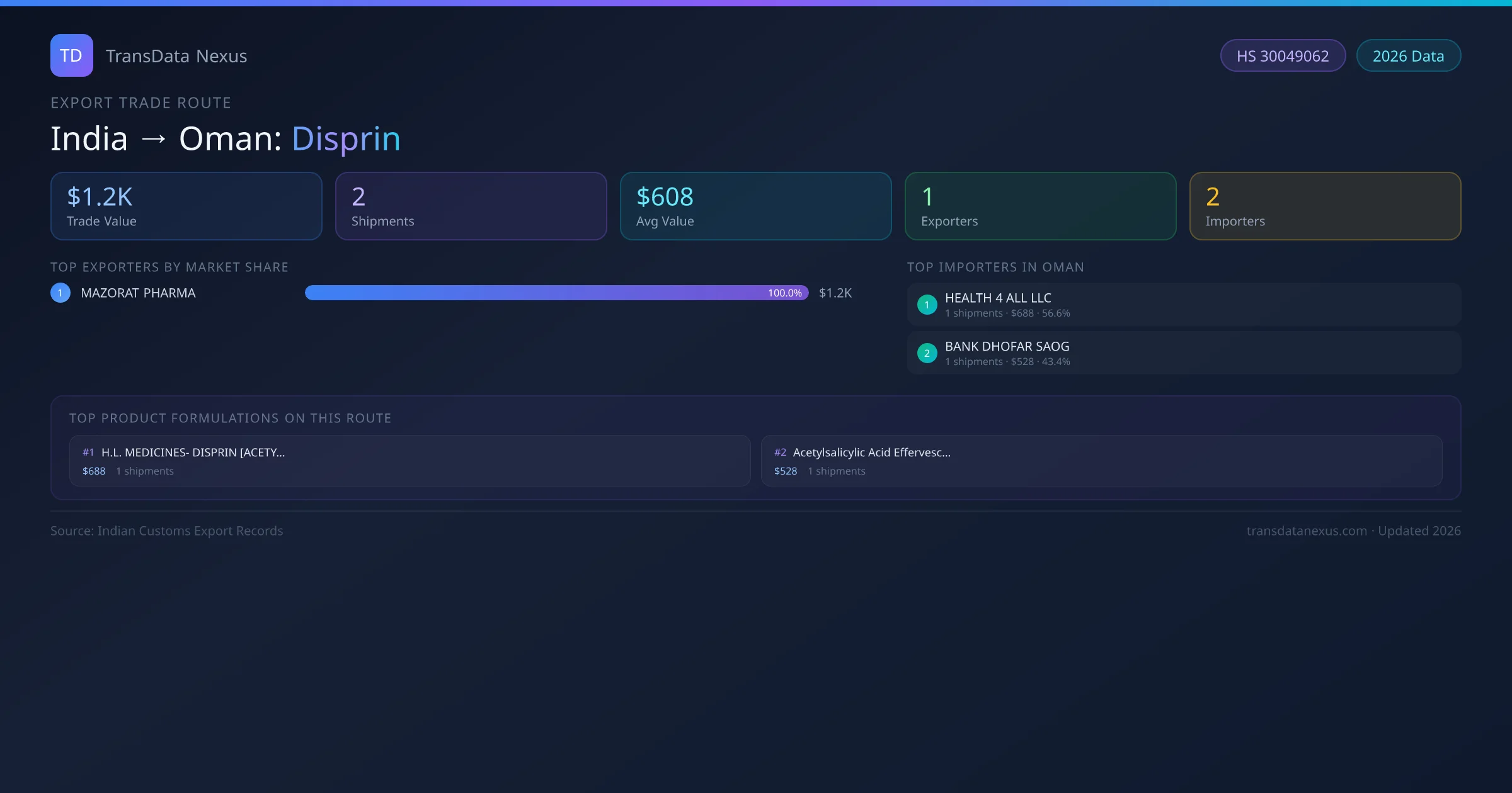 The India to Oman Disprin corridor is one of India's established pharmaceutical export routes, with 2 shipments documented worth a combined $1.2K USD. The route is dominated by MAZORAT PHARMA, which alone accounts for roughly 100% of all export value, reflecting the consolidated nature of India's disprin manufacturing sector.