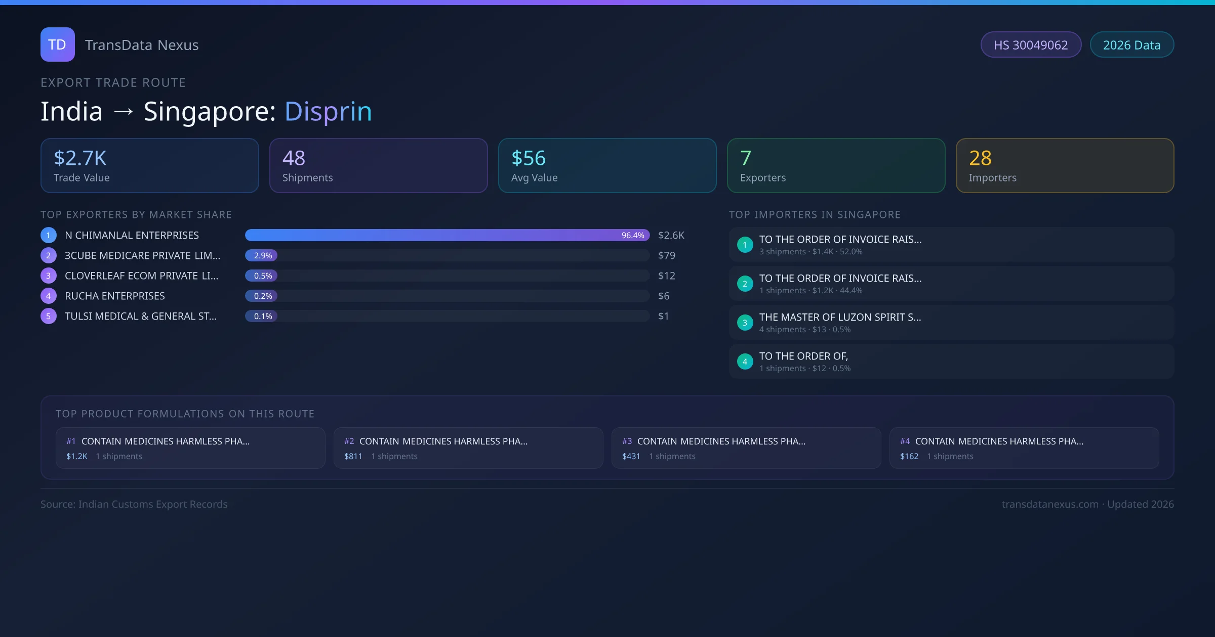 The India to Singapore Disprin corridor is one of India's established pharmaceutical export routes, with 48 shipments documented worth a combined $2.7K USD. The route is dominated by N CHIMANLAL ENTERPRISES, which alone accounts for roughly 96% of all export value, reflecting the consolidated nature of India's disprin manufacturing sector.