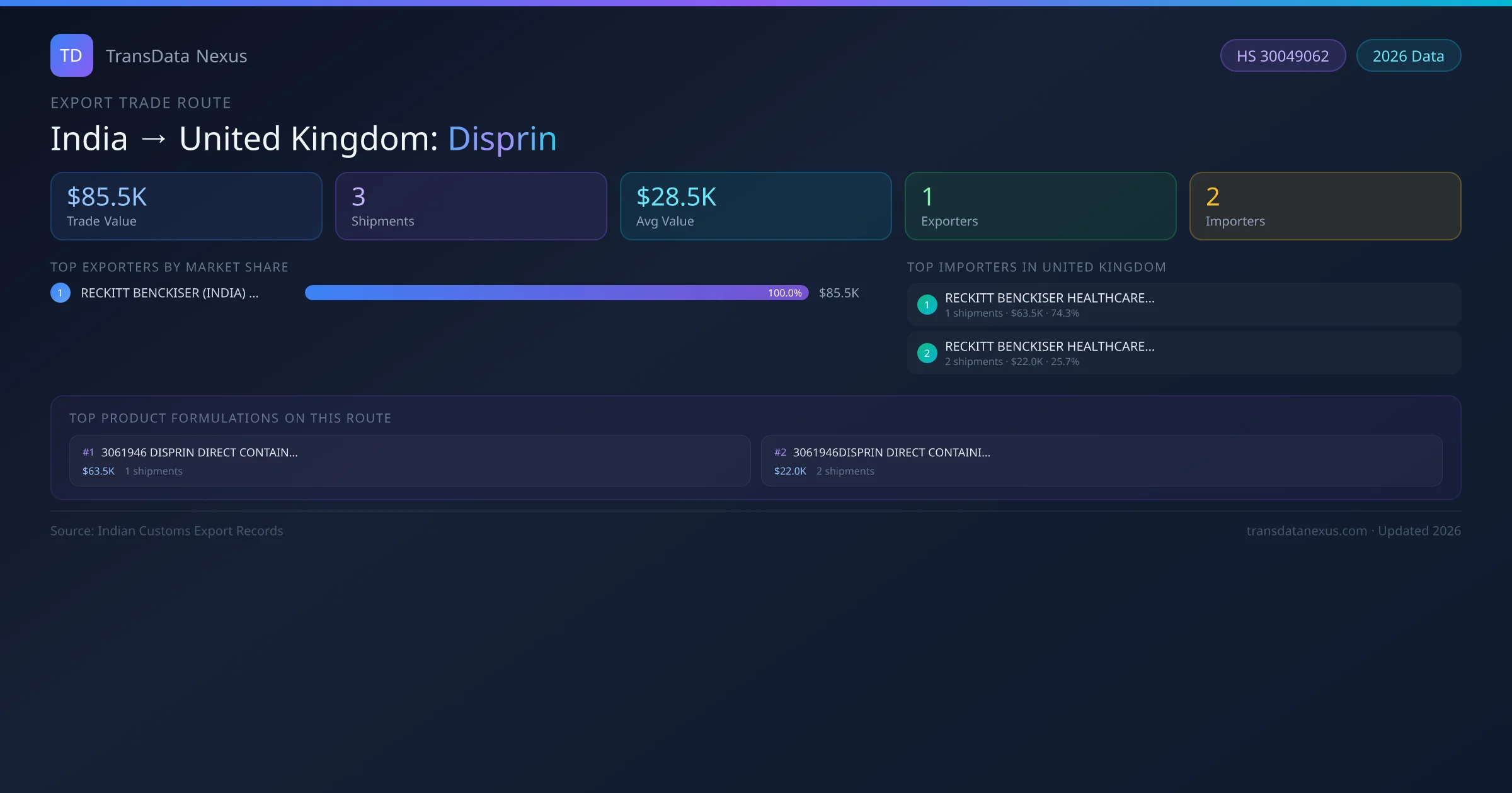 The India to United Kingdom Disprin corridor is one of India's established pharmaceutical export routes, with 3 shipments documented worth a combined $85.5K USD. The route is dominated by RECKITT BENCKISER (INDIA) PRIVATE LIMITED, which alone accounts for roughly 100% of all export value, reflecting the consolidated nature of India's disprin manufacturing sector.