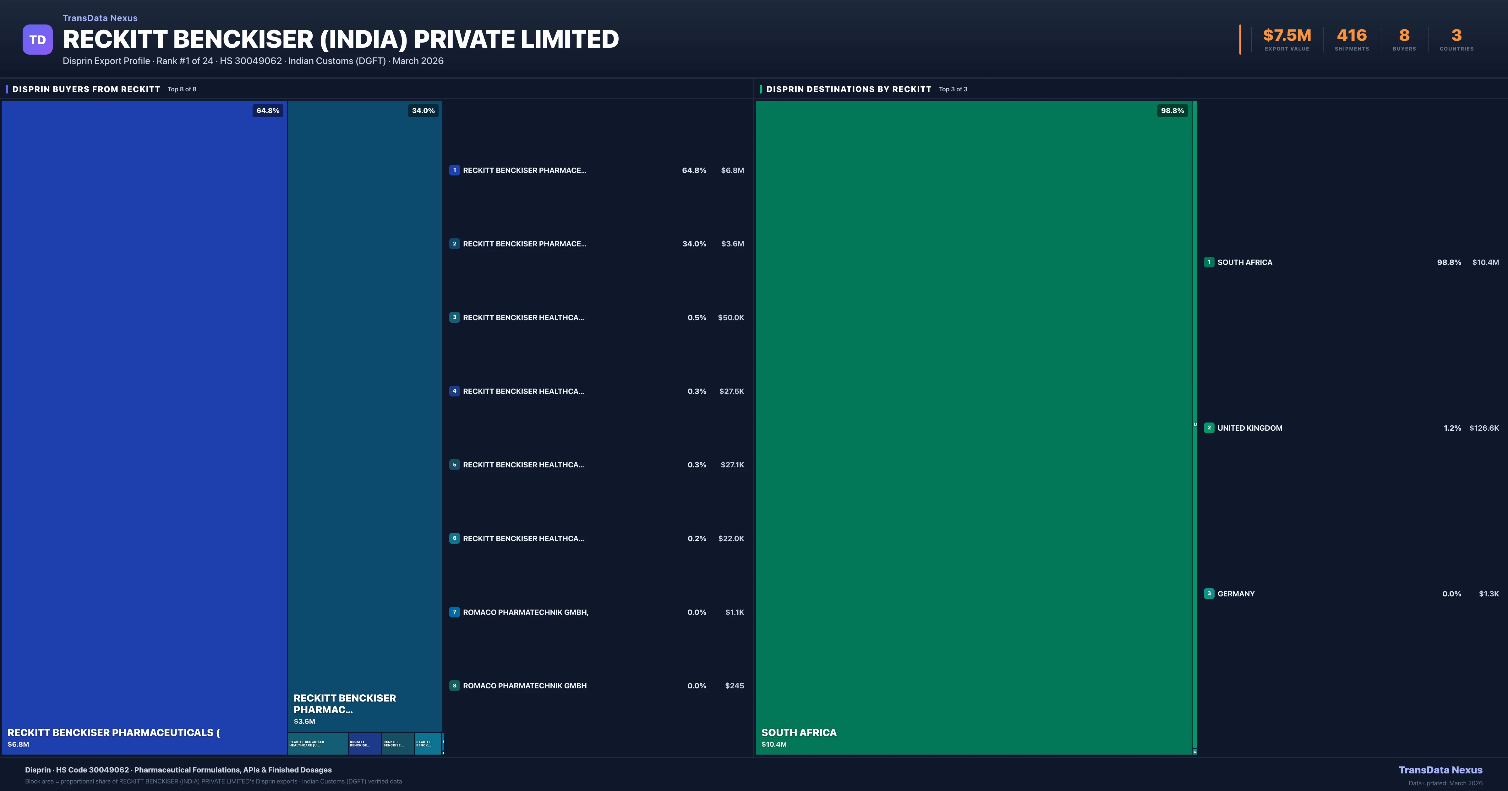 Reckitt Benckiser (india) Private Limited supplies Disprin to 8 buyers globally. The largest buyer is RECKITT BENCKISER PHARMACEUTICALS ( (SOUTH AFRICA), followed by RECKITT BENCKISER PHARMACEUTICALS (SOUTH AFRICA) and RECKITT BENCKISER HEALTHCARE (UK) L (UNITED KINGDOM). These buyers represent pharmaceutical distributors, hospital groups, and government procurement agencies in their respective markets.