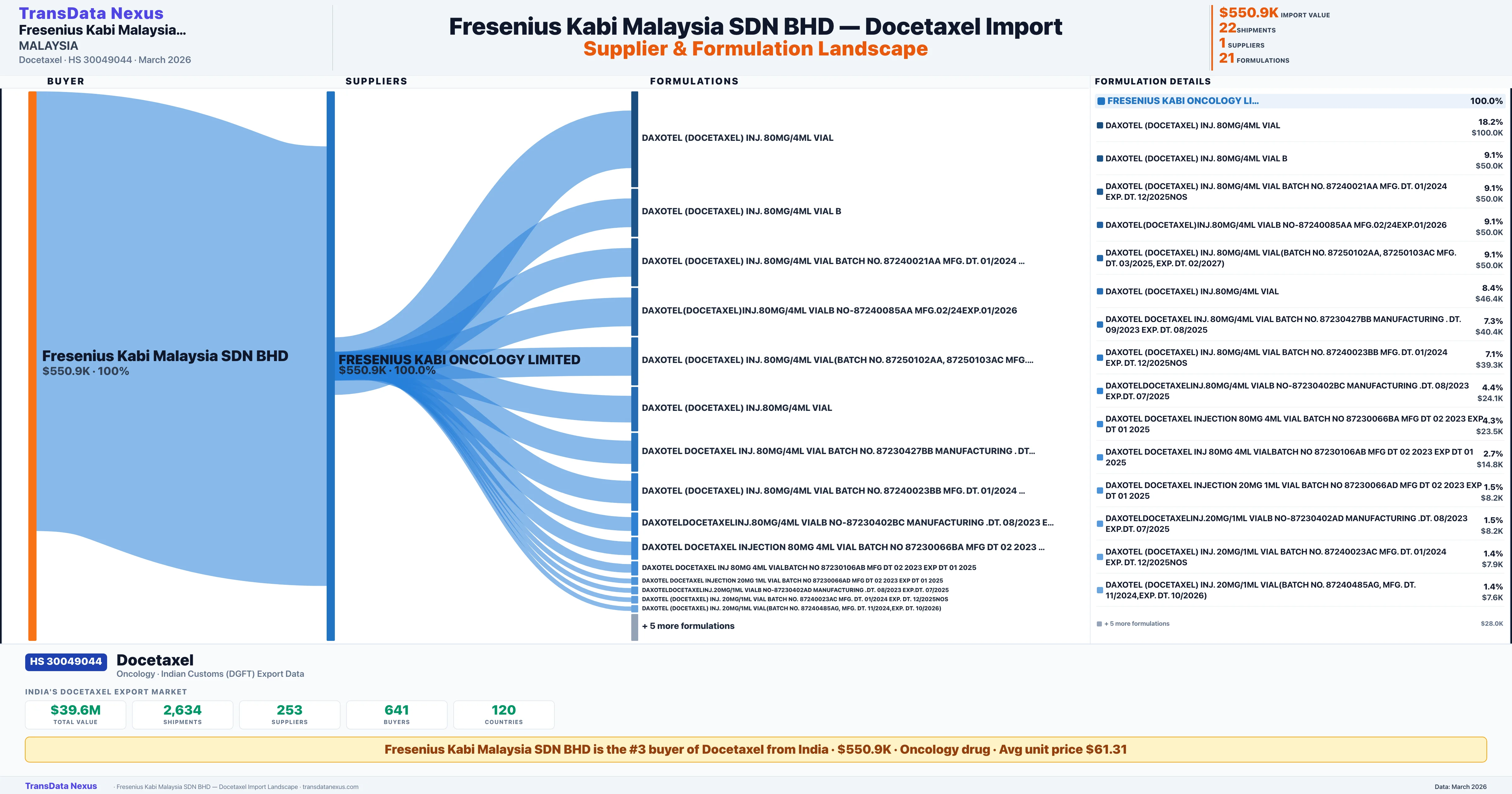 FRESENIUS KABI MALAYSIA SDN BHD sources Docetaxel from 1 verified Indian supplier: FRESENIUS KABI ONCOLOGY LIMITED ($550.9K, 100.0%). This is based on 22 customs records.