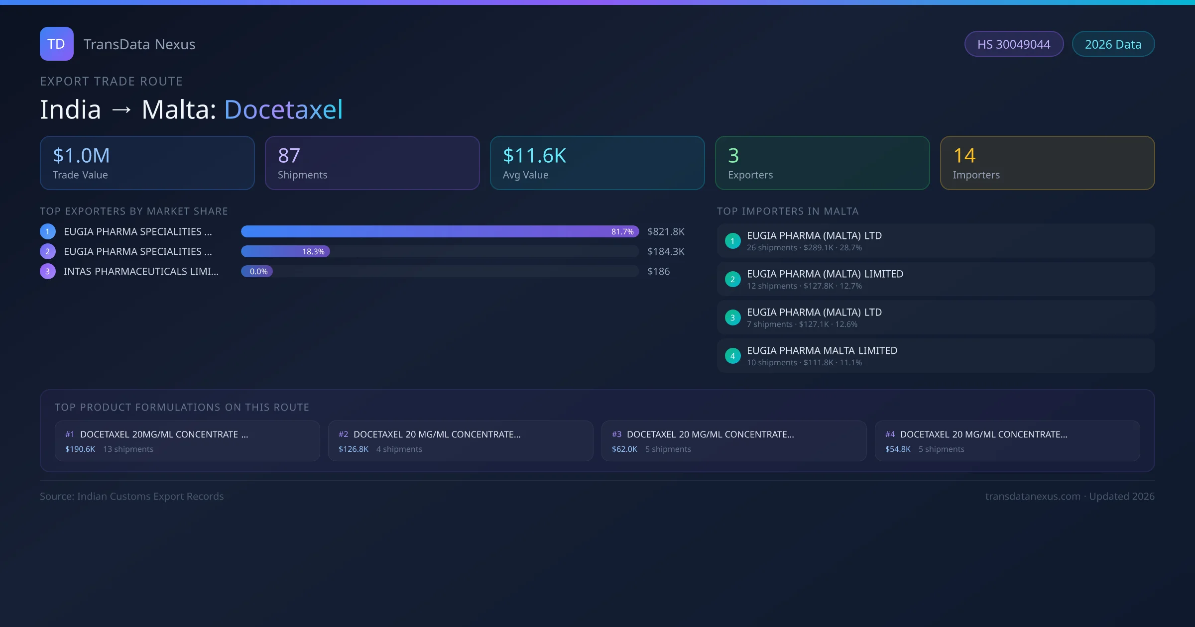 On the buying side, EUGIA PHARMA (MALTA) LTD is the largest importer with 26 shipments worth $289.1K USD — representing 29% of all docetaxel imports from India on this route. A total of 14 buyers are active on this corridor.