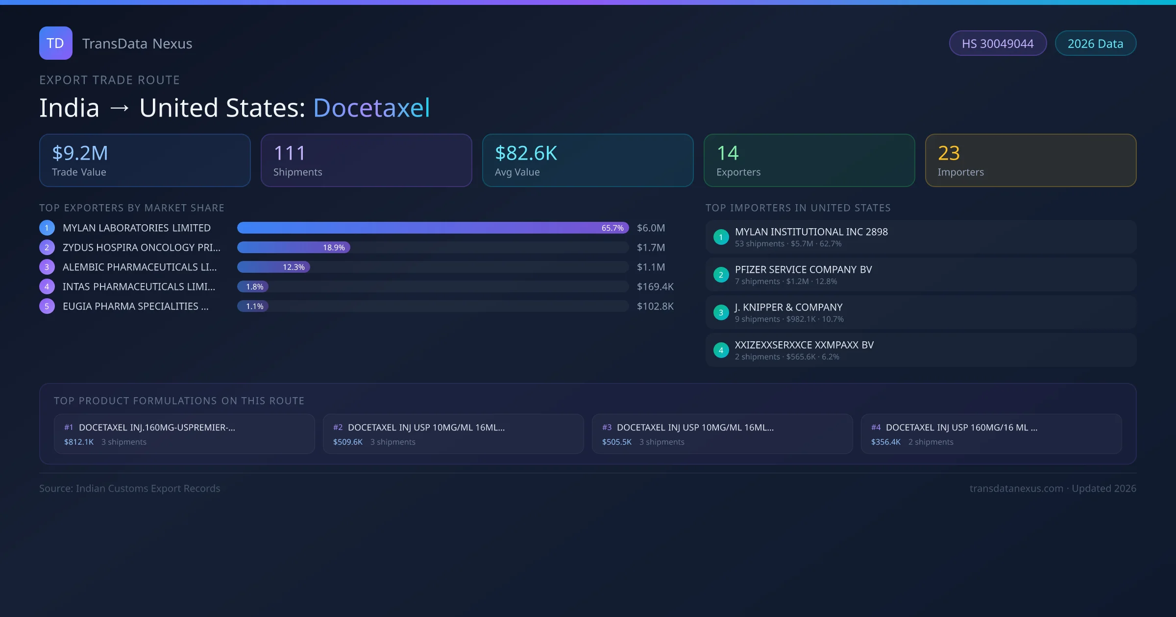 The India to United States Docetaxel corridor is one of India's established pharmaceutical export routes, with 111 shipments documented worth a combined $9.2M USD. The route is dominated by MYLAN LABORATORIES LIMITED, which alone accounts for roughly 66% of all export value, reflecting the consolidated nature of India's docetaxel manufacturing sector.