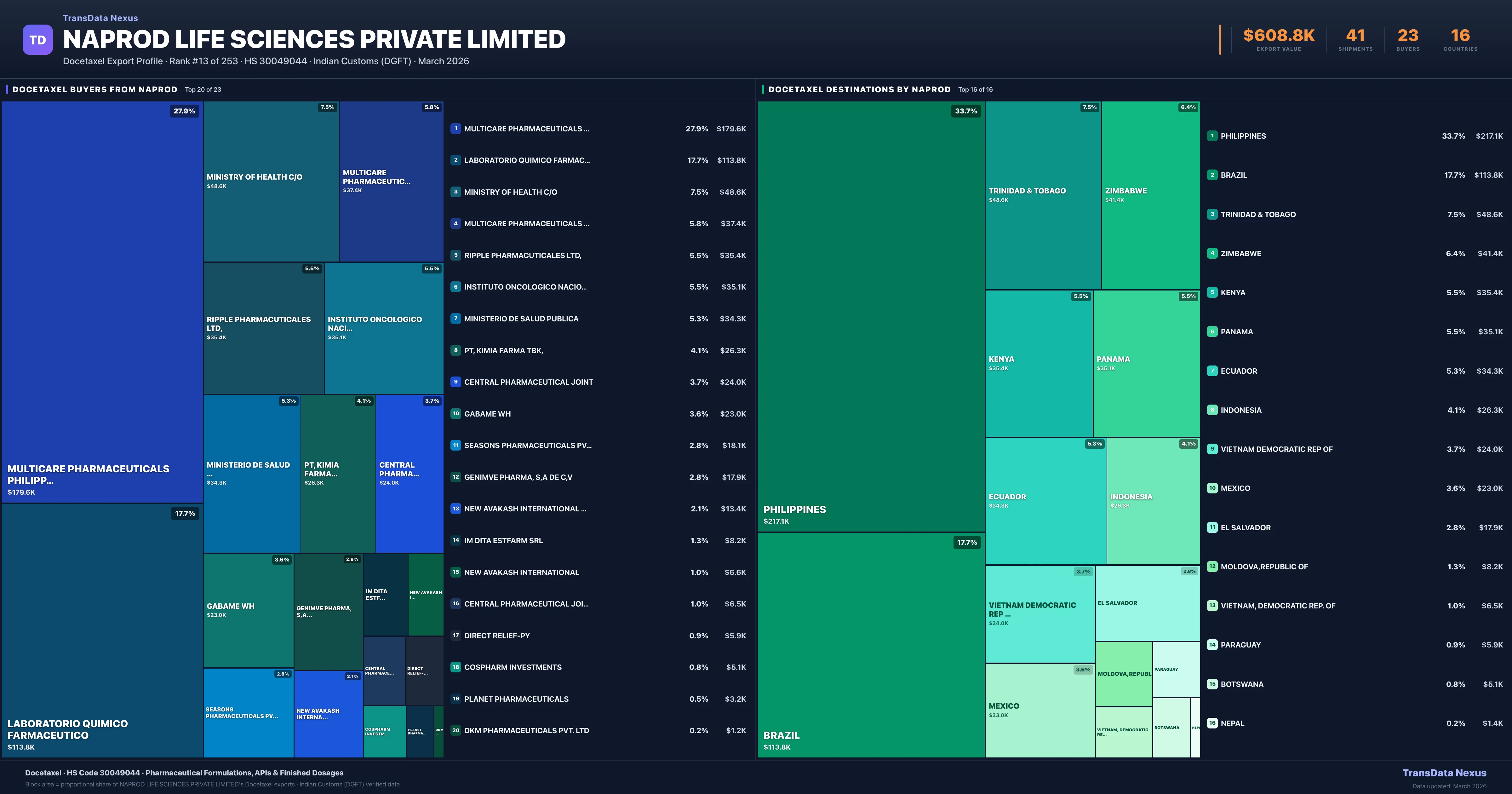 Naprod Life Sciences Private Limited supplies Docetaxel to 23 buyers globally. The largest buyer is MULTICARE PHARMACEUTICALS PHILIPPIN (PHILIPPINES), followed by LABORATORIO QUIMICO FARMACEUTICO (BRAZIL) and MINISTRY OF HEALTH C/O (TRINIDAD & TOBAGO). These buyers represent pharmaceutical distributors, hospital groups, and government procurement agencies in their respective markets.