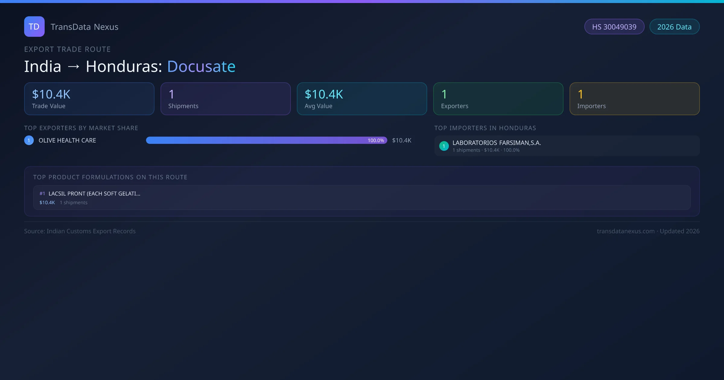 India has recorded 1 verified shipments of Docusate exported to Honduras, representing a combined trade value of $10.4K USD. This corridor is served by 1 active Indian exporters, with an average shipment value of $10.4K USD. The leading Indian exporter is OLIVE HEALTH CARE, which accounts for 100% of total export value with 1 shipments worth $10.4K USD. On the buying side, LABORATORIOS FARSIMAN,S.A. is the largest importer in Honduras with $10.4K USD in purchases. All data sourced from Indian Customs (DGFT) shipping bill records. Values reported in FOB USD.