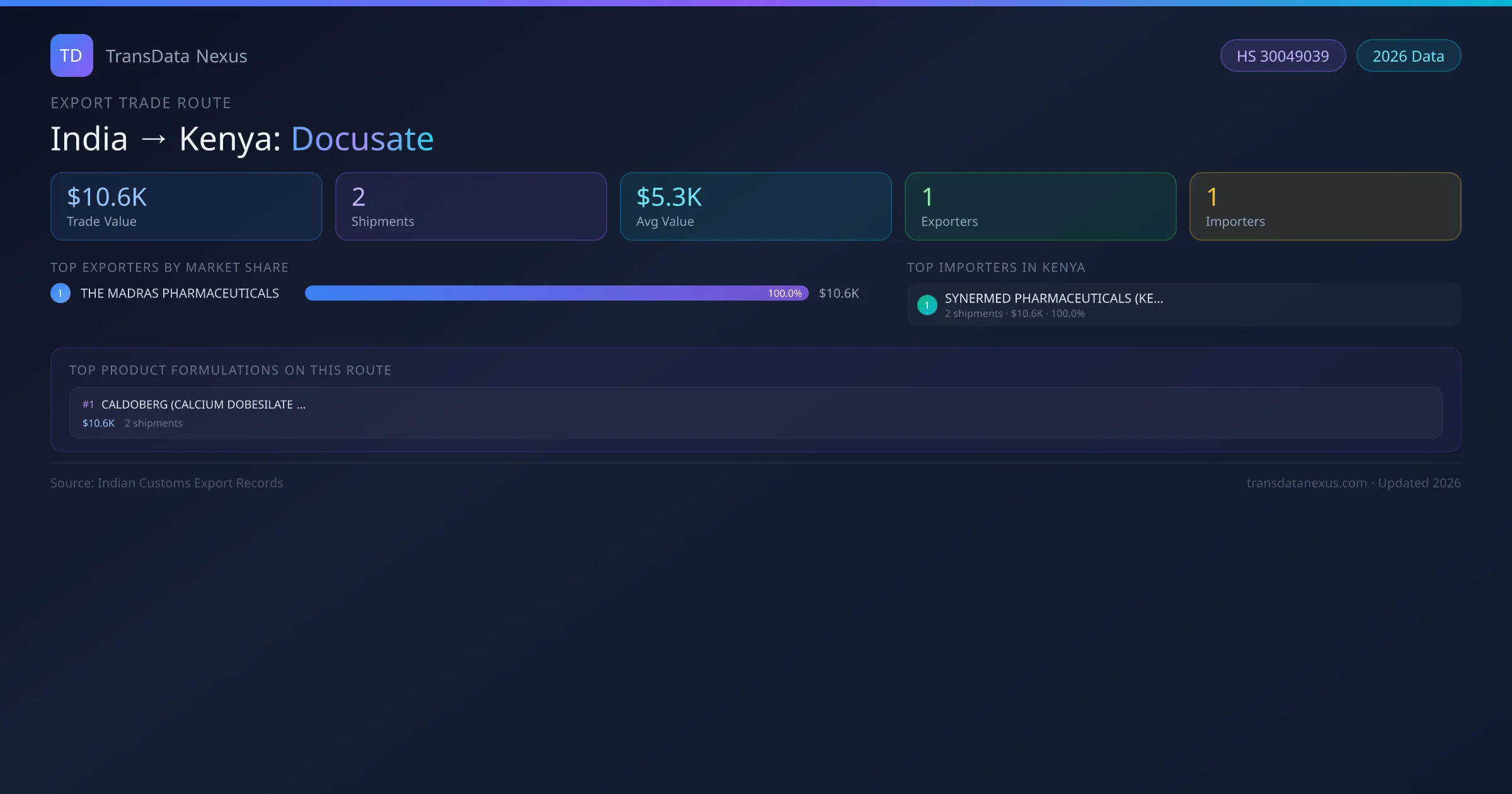 - 1.Route Identification: India to Kenya export trade corridor identified from Indian Customs (DGFT) records for Docusate.