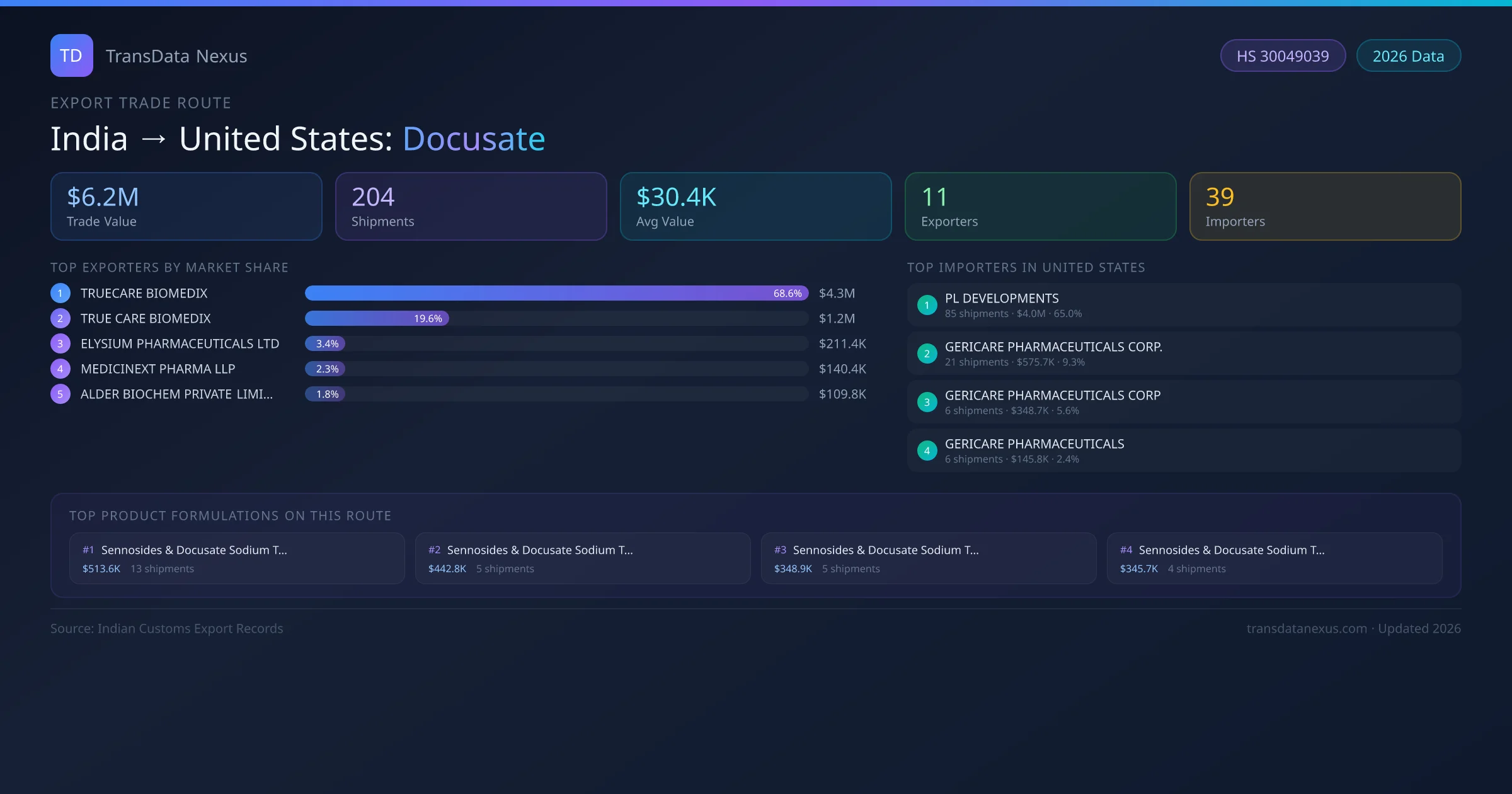 India exports Docusate to United States worth approximately $6.2M USD across 204 recorded shipments. The average value per shipment is $30.4K USD.