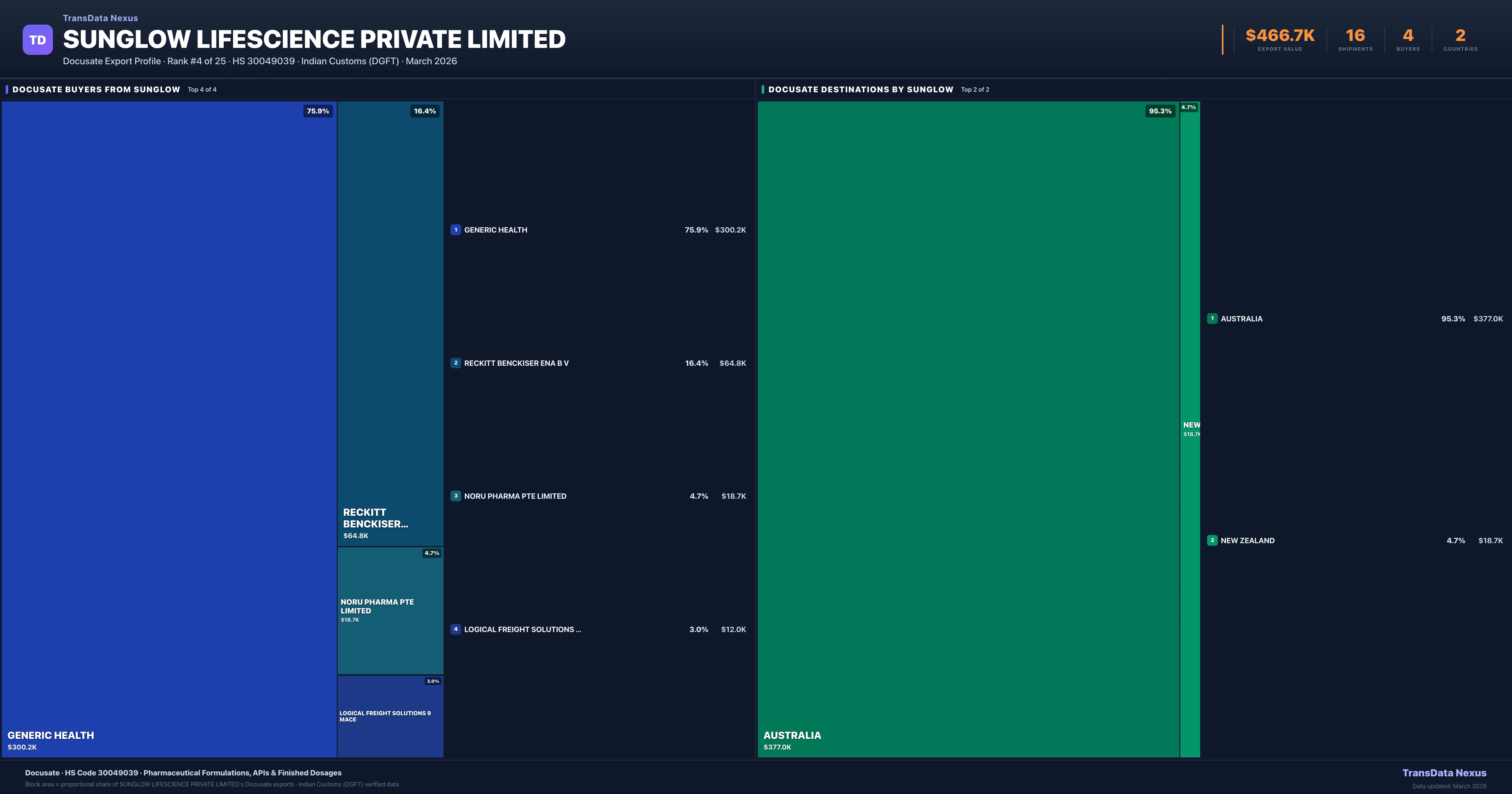 Sunglow Lifescience Private Limited supplies Docusate to 4 buyers globally. The largest buyer is GENERIC HEALTH (AUSTRALIA), followed by RECKITT BENCKISER ENA B V (AUSTRALIA) and NORU PHARMA PTE LIMITED (NEW ZEALAND). These buyers represent pharmaceutical distributors, hospital groups, and government procurement agencies in their respective markets.