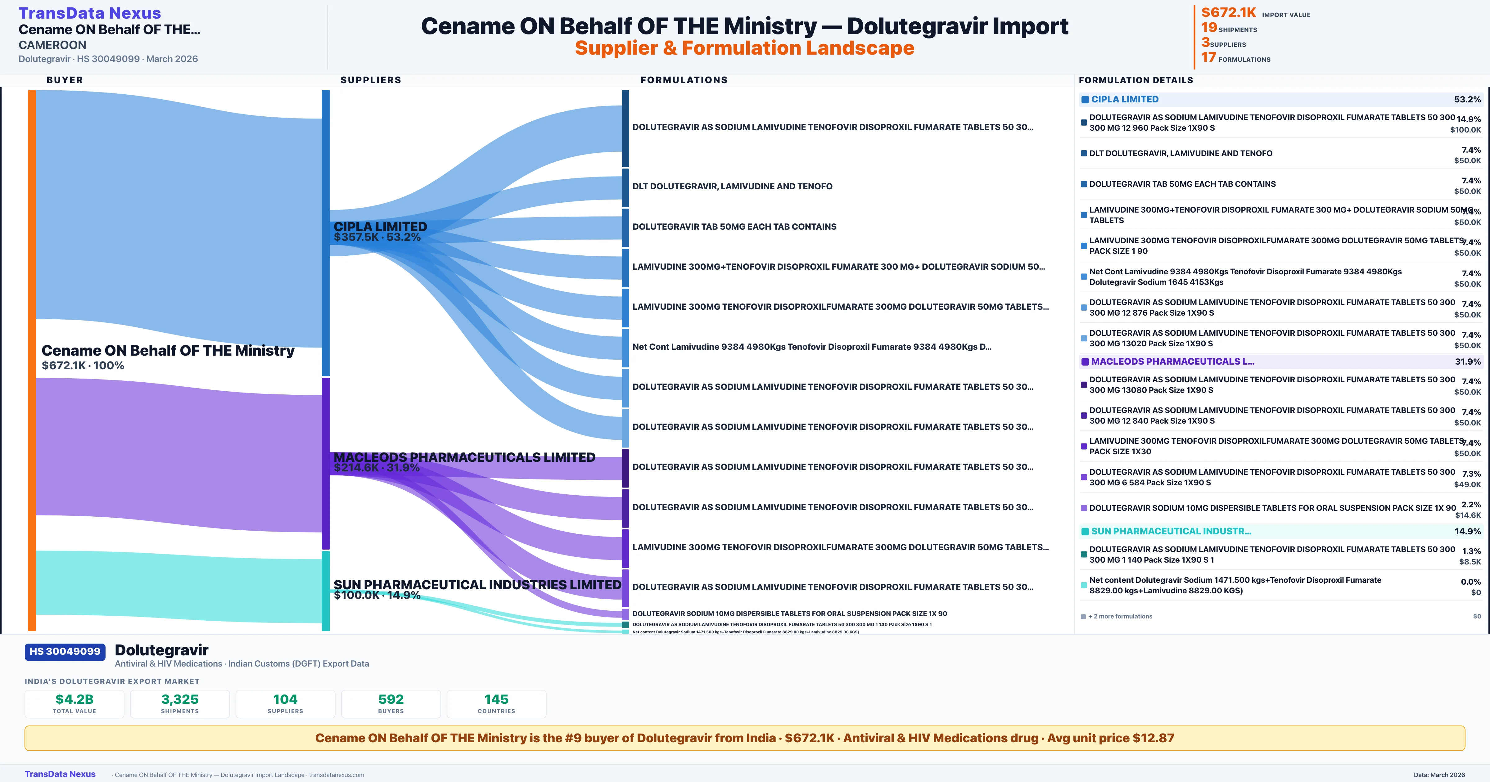 Pharmaceutical Importer Β· #9 buyer for Dolutegravir Β· $672.1K import value Β· 19 shipments Β· CAMEROON Β· DGFT Verified
