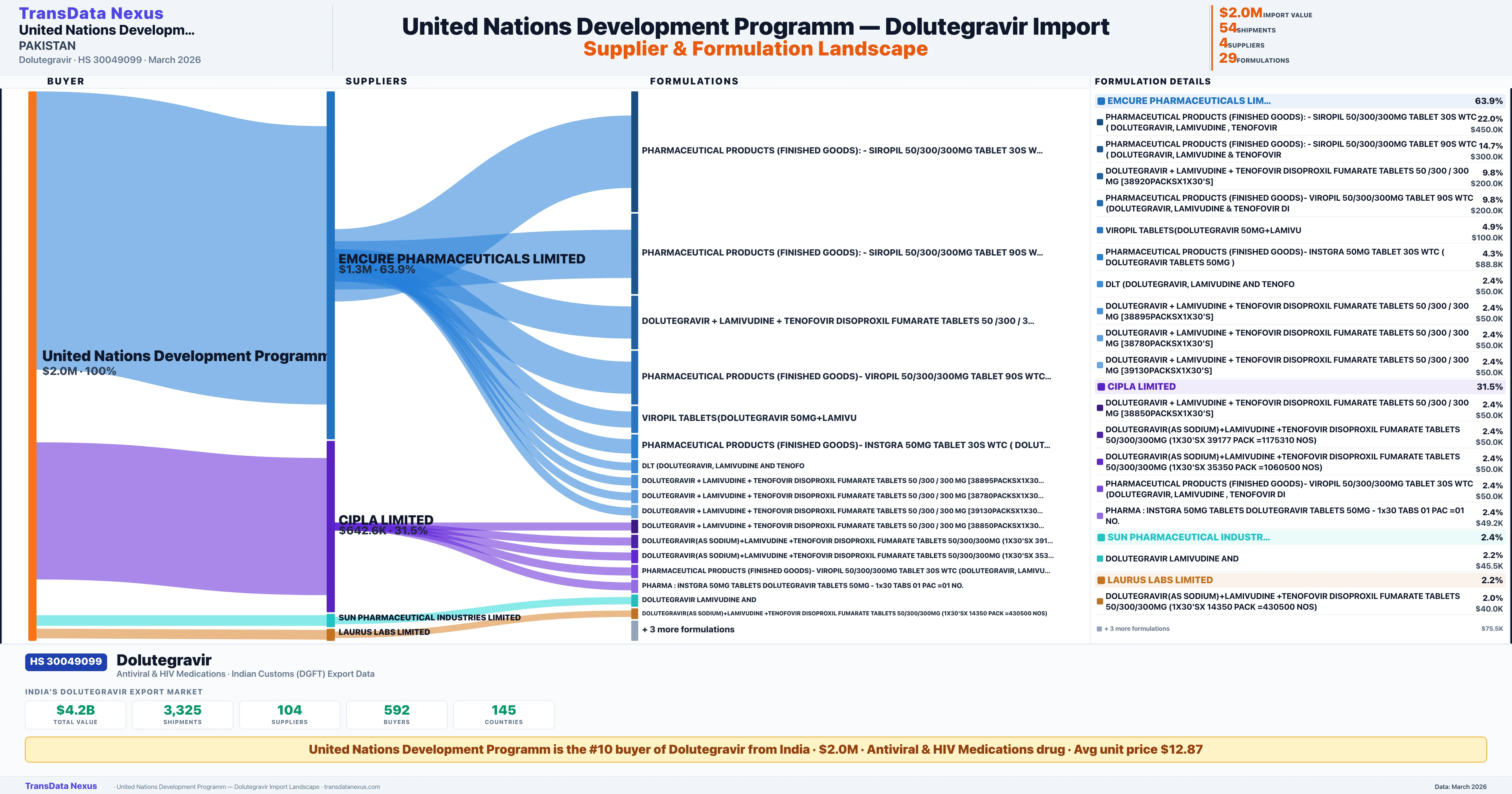UNITED NATIONS DEVELOPMENT PROGRAMM is the #10 importer of Dolutegravir from India with $2.0M in import value and 54 verified shipments. UNITED NATIONS DEVELOPMENT PROGRAMM holds a 0.0% market share in Dolutegravir imports based in PAKISTAN. The company sources from 4 verified suppliers across 29 formulations shipped to 9 countries. Overall, UNITED NATIONS DEVELOPMENT PROGRAMM imports 3 pharmaceutical products worth $2.8M across 1 therapeutic categories.