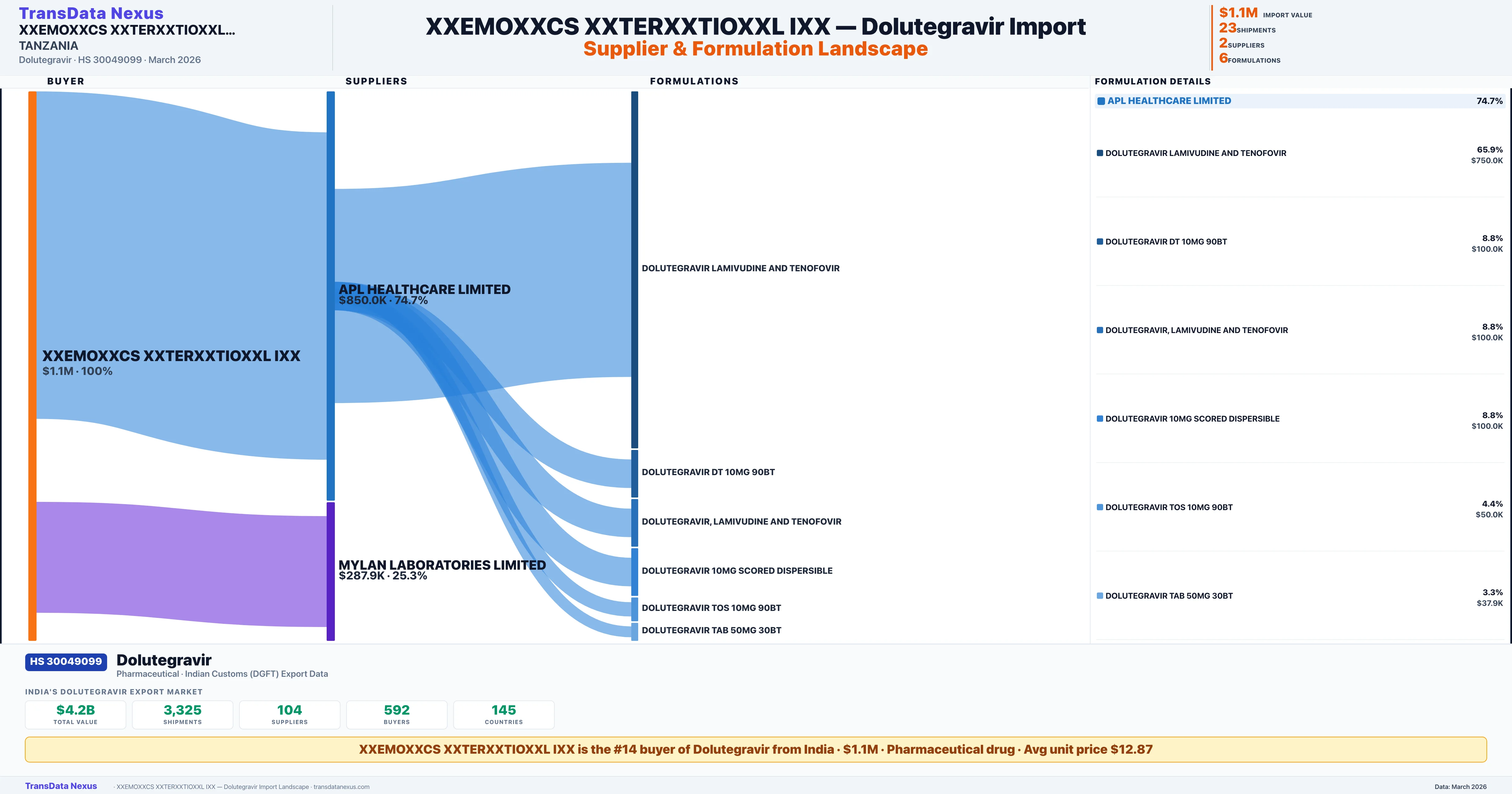 XXEMOXXCS XXTERXXTIOXXL IXX is the #14 importer of Dolutegravir from India with $1.1M in import value and 23 verified shipments. XXEMOXXCS XXTERXXTIOXXL IXX holds a 0.7% market share in Dolutegravir imports based in TANZANIA. The company sources from 2 verified suppliers across 6 formulations shipped to 10 countries.