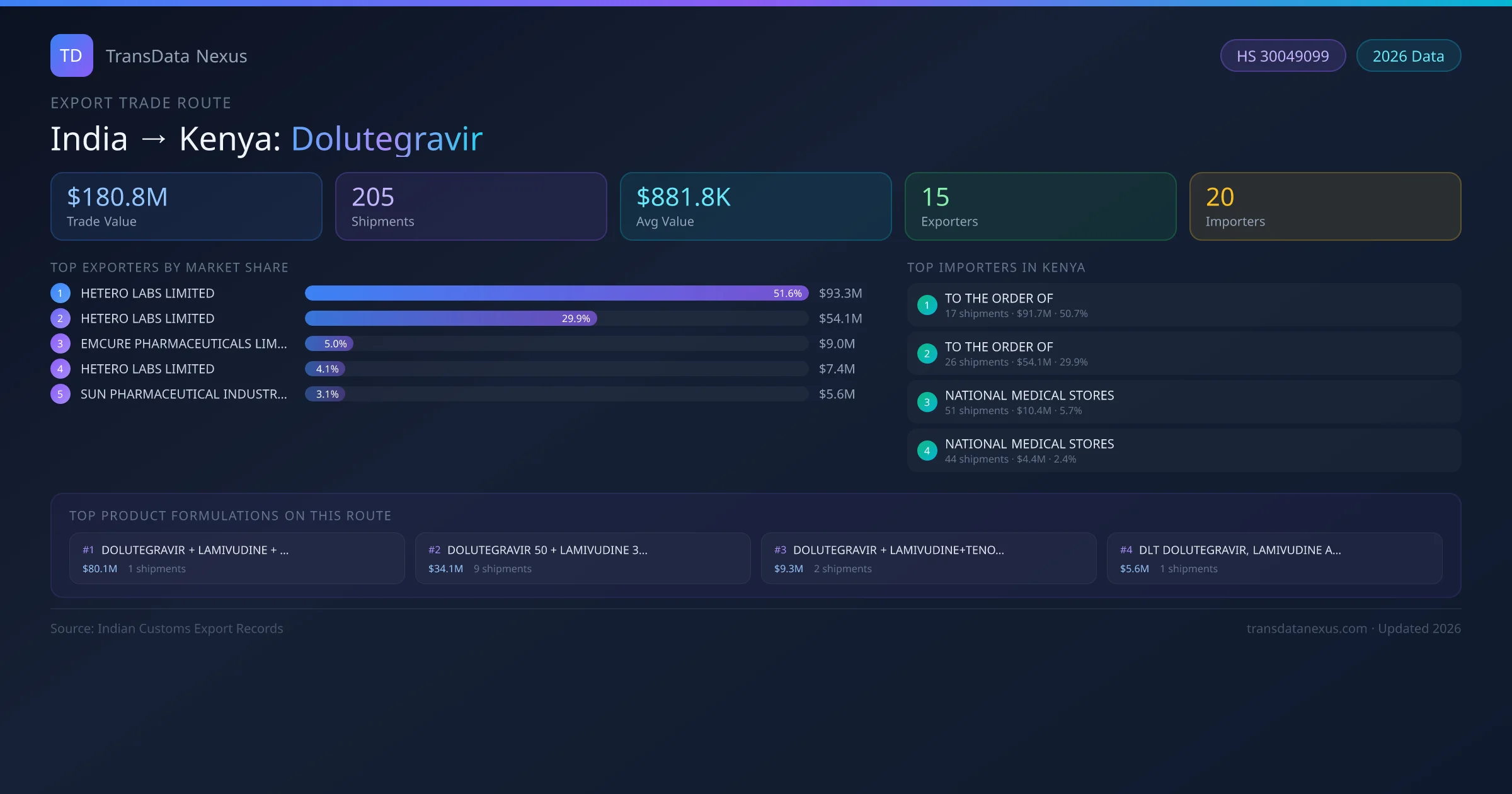 - 1.Route Identification: India to Kenya export trade corridor identified from Indian Customs (DGFT) records for Dolutegravir.