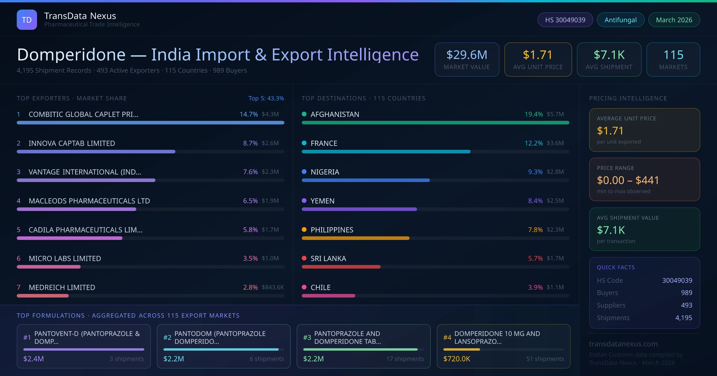 Between 2022 and 2026, India exported $29.6M worth of domperidone across 4,195 verified shipments to 115 countries — covering 59% of world markets in the Gastrointestinal segment. The largest destination is AFGHANISTAN (19.4%). COMBITIC GLOBAL CAPLET PRIVATE LIMITED leads with a 14.7% share. All figures are drawn from Indian Customs (DGFT) shipping bill records spanning four years of trade activity.