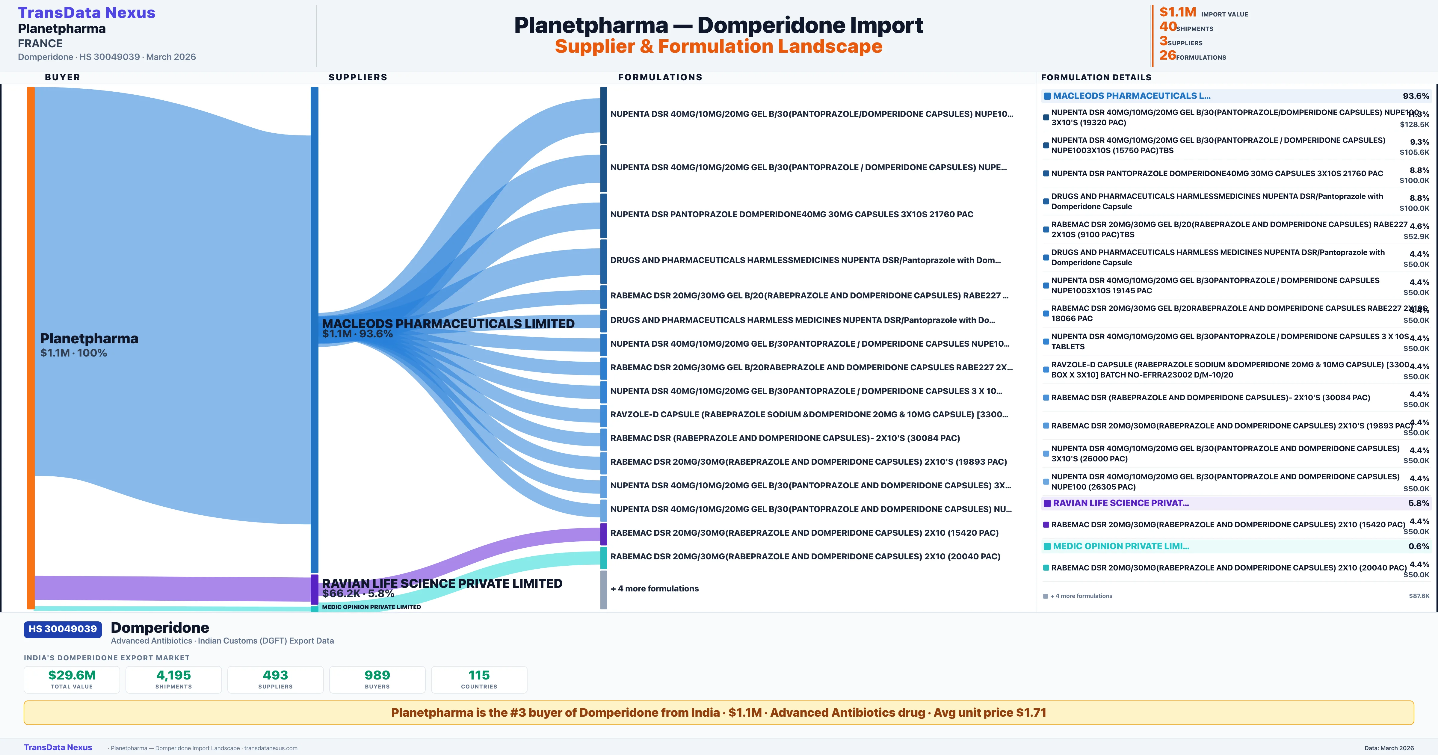 PLANETPHARMA sources Domperidone from 3 verified Indian suppliers: MACLEODS PHARMACEUTICALS LIMITED ($1.1M, 93.6%), RAVIAN LIFE SCIENCE PRIVATE LIMITED ($66.2K, 5.8%), MEDIC OPINION PRIVATE LIMITED ($7.1K, 0.6%). This is based on 40 customs records.