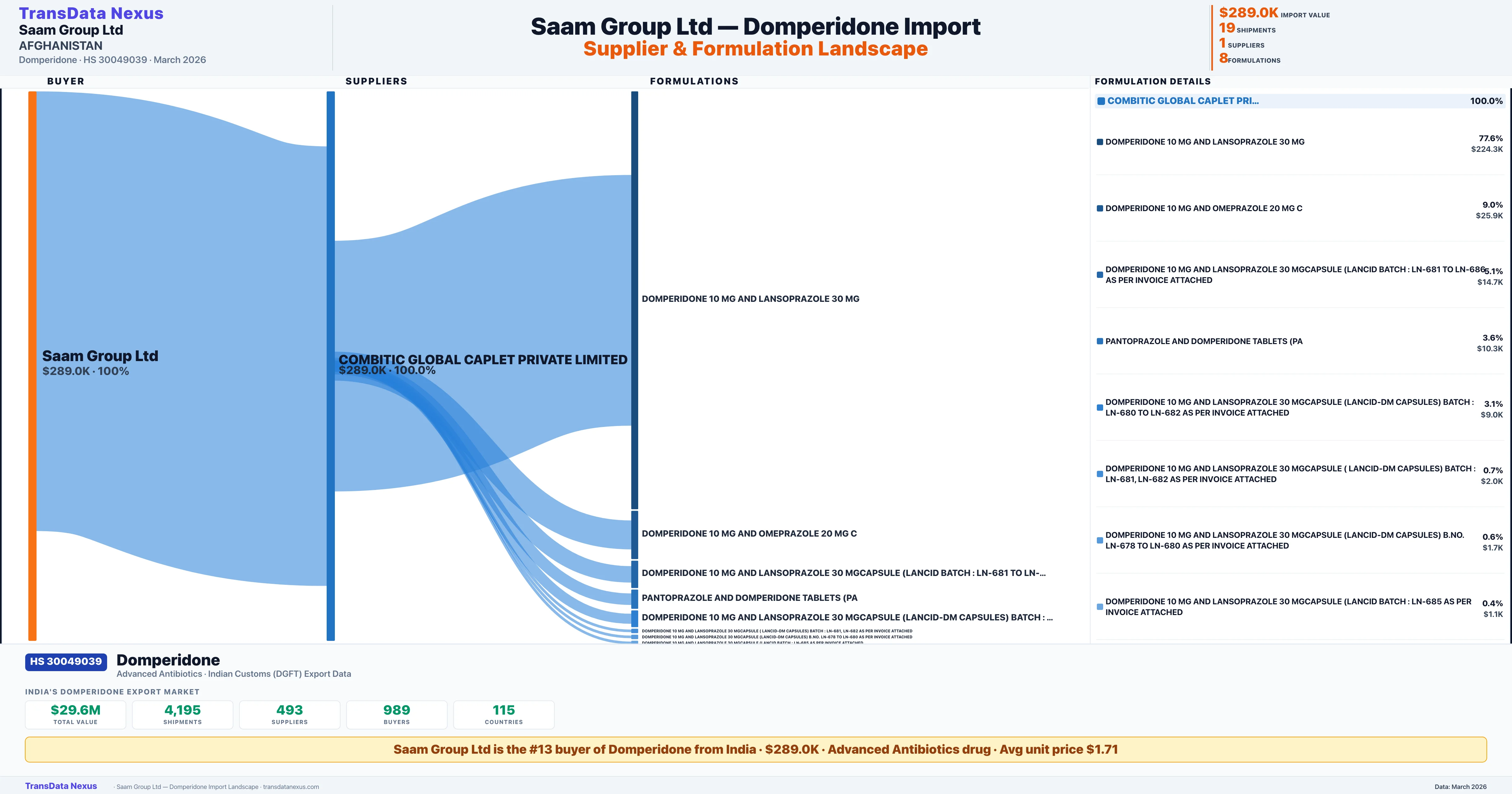 SAAM GROUP LTD. sources Domperidone from 1 verified Indian supplier: COMBITIC GLOBAL CAPLET PRIVATE LIMITED ($289.0K, 100.0%). This is based on 19 customs records.