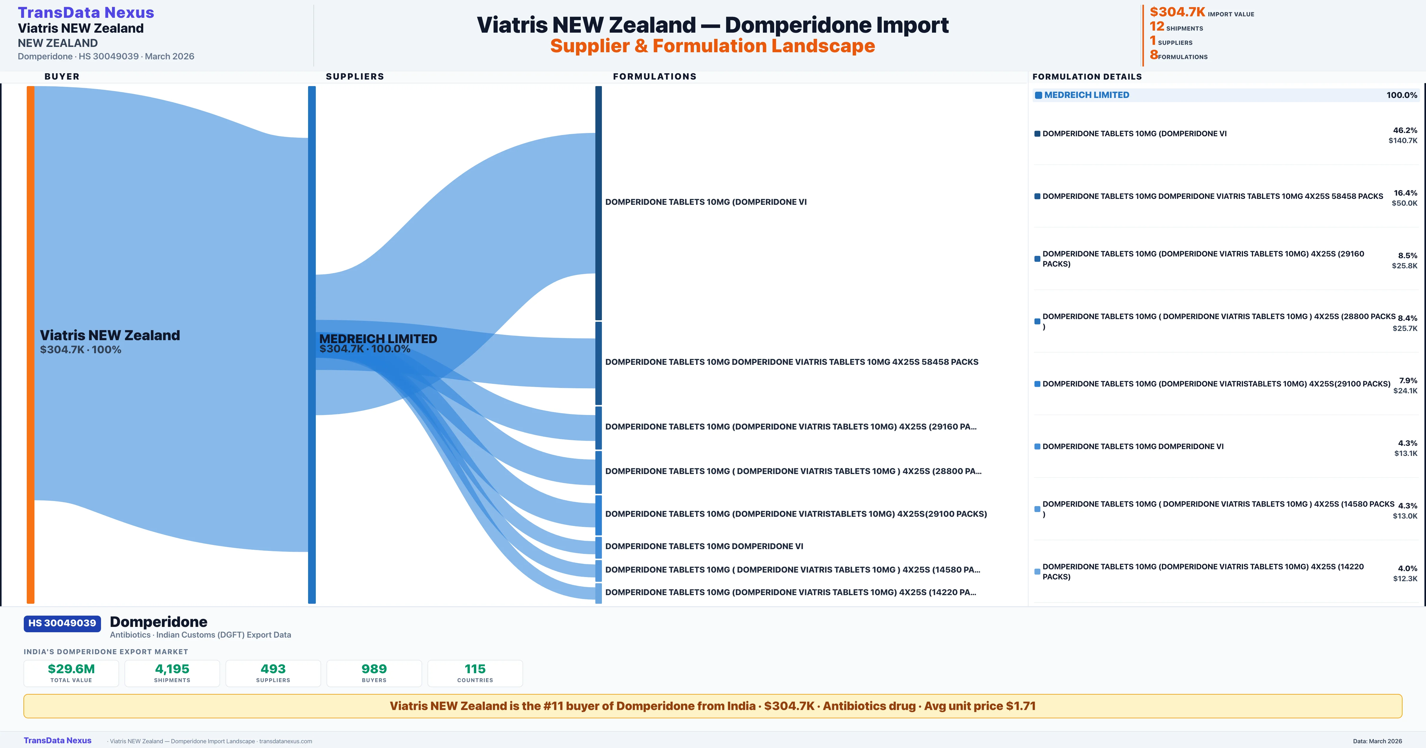 VIATRIS NEW ZEALAND sources Domperidone from 1 verified Indian supplier: MEDREICH LIMITED ($304.7K, 100.0%). This is based on 12 customs records.